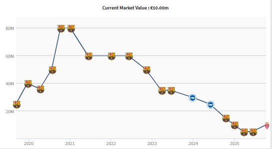 这也是法蒂近4年来首次身价上涨,在4年前他的巅峰身价曾达到8000万欧,随后一路下滑至500万欧。