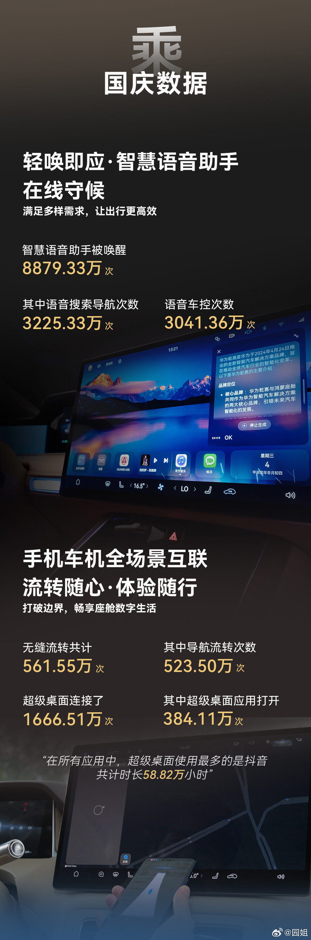 #华为乾崑#国庆出行报告来了,这个国庆,开着带华为乾崑的车出门貌似已经成为了时尚,辅助驾驶一共跑了2.94亿公里,相当于绕地球7350圈,这个数据是不是有点惊喜。而且车位到车位2.0功能用了101万次,妥妥的懒人福音,语音助手被喊了8879万次,平均每人用超100次,导航、控车动动嘴就成,太适合不爱动手的懒人了。