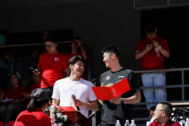 中国游泳名将、奥运冠军、亚运“五金王”徐嘉余,与中国男篮内线核心、CBA总冠军成员暨2021-22赛季常规赛MVP、浙江广厦男篮队长胡金秋现身,与集团师生共同完成了一场火炬接力。徐嘉余与建兰中学初三学生毛偲辰,一起将火炬传递到杭州建兰教育集团总校长,杭州市建兰中学党委书记饶美红的手中,共同开启这次特别的校运会。