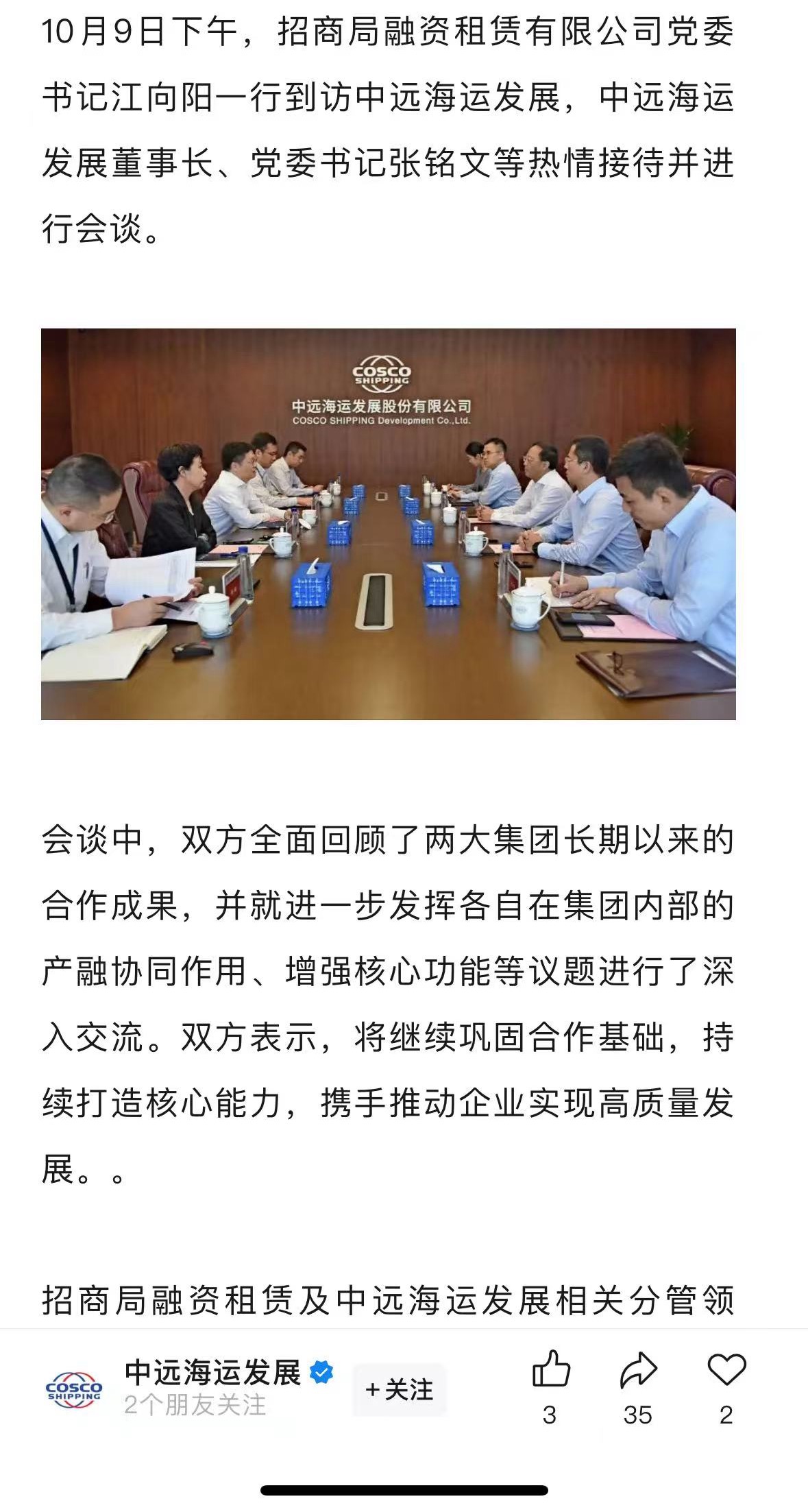 上证报中国证券网讯(记者何漪)10月10日,据“中远海运发展”微信公众号消息,招商局融资租赁有限公司党委书记江向阳一行于10月9日到访中远海运发展,与中远海运发展董事长、党委书记张铭文等举行工作会谈。