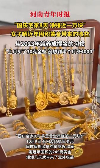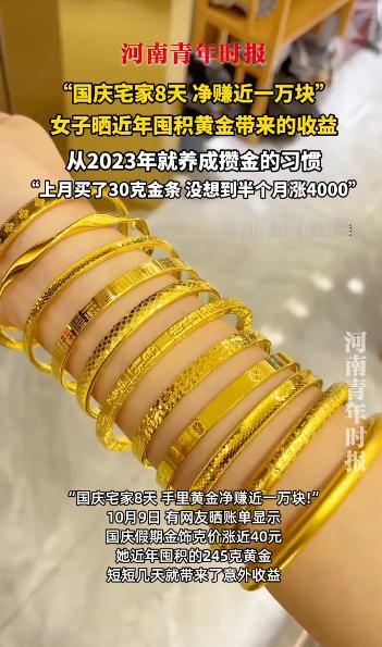 “简直赚翻了!”10月9日,四川成都,一女子国庆长假在家宅了8天,囤下的245克金子竟然让她躺赚了近10000元!半个月前女子刚在深圳购入了30克金条,光这部分就涨了4000元,她晒出自己的黄金收益账单,网友:黄金光看着就让人安心! 金价这几年接连攀升,翻了好几番,今年国庆金首饰克价涨了接近40元,这让不少平时喜欢买金首饰的人乐开了花。 一女子从23年开始就养成了攒金子的习惯,平时手头有闲钱就会去购买一些金手镯、金项链等饰品,她刚开始购买时金价大约是四五百元,两年来陆陆续续攒了245克黄金,为自己打下了一片金子江山。 国庆长假期间金饰价格再涨,女子宅家8天,手中的245克金饰让她净赚了小1万元,这可把女子高兴坏了,这是真的“躺赚”! 值得一提的是,上个月女子到深圳旅游时购买了一块30g的金条,这块金条在短短半个月内就为女子带来了4000元的收益。 女子将自己黄金收益的账单和各种金饰分享到了网上,不少网友都表示羡慕,金价这几年不断增长,在中国人的观念里金子作为一种避险资产也让人安心! 信息来源:《国庆金价单克上涨超40元 网友晒“幸福账单”:囤200多克黄金8天假期“躺赚”近万元》封面新闻