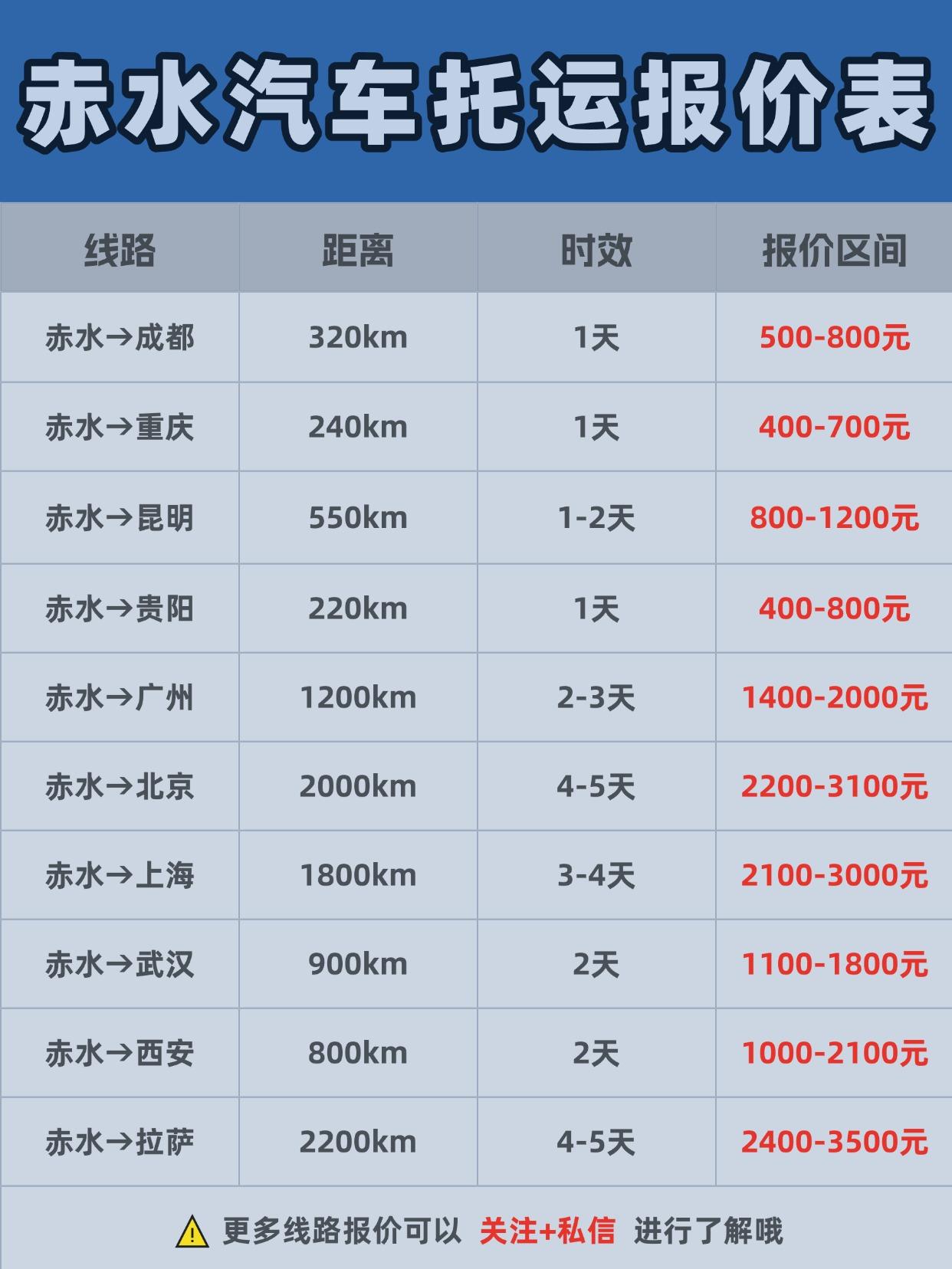 全国报价 & 时效大盘点✨ 🚗 赤水发全国报价区间: ✅ 常规线路:¥1800 - ¥4500 ✅ 超远距离(新疆/东北):¥5000+ ⏱ 时效参考: 邻近省份:2-3天直达 北上广深:3-5天 西藏/新疆:7-10天 🔥 灵魂拷问1:车坏了/没油能托运吗? 👉 能救!但加钱! ⚠️ 需额外支付: ✔ 拖车费(赤水市内¥200-500) ✔ 加固费(¥300起) ❗ 提前告知物流公司!安排特种拖车! 🔥 灵魂拷问2:火车托运全国都能到? 🚫 大漏特漏! ✘ 仅通铁路城市可运(如成都/重庆/昆明) ✘ 费用比公路高20%-30% ✘ 时效更慢+取送车麻烦 💡 公路物流更香!门到门直送yyds! 💡 托运防坑指南 1️⃣ 清空物品!油量≤1/4(安全第一) 2️⃣ 签合同!标明里程/价格/保险 3️⃣ 买保险!按车辆估值投保(物流公司必须配合) 4️⃣ 验车拍照!划痕/凹陷留证据
