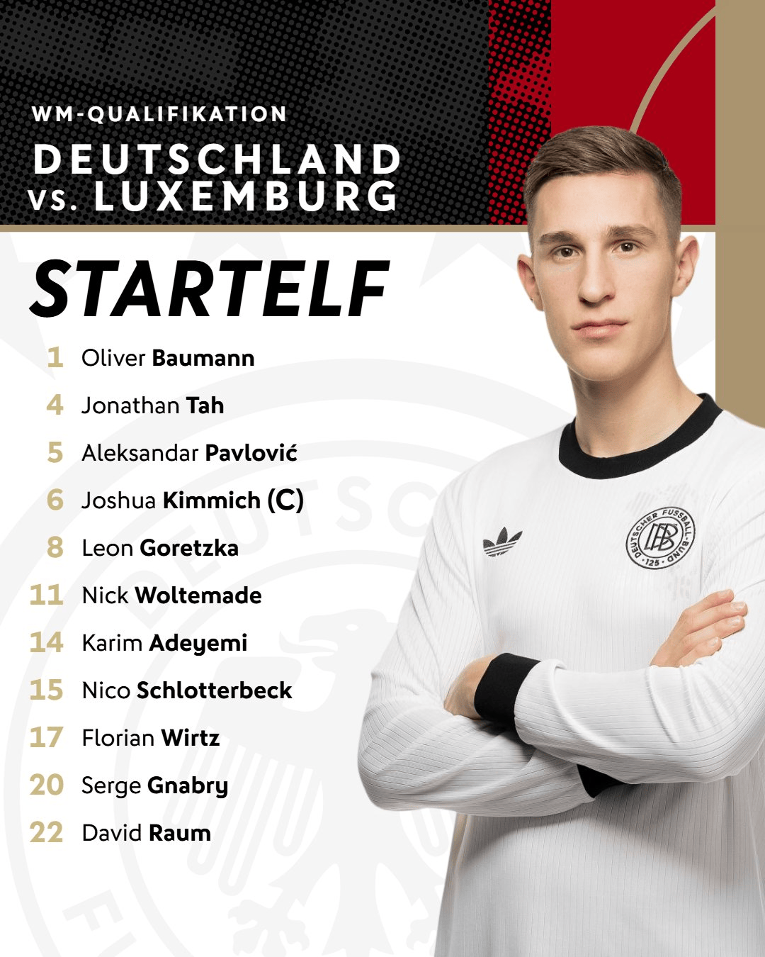 虎扑10月11日讯北京时间2:45,世界杯欧洲区预选赛将展开一场焦点战,德国主场迎战卢森堡。赛前,双方公布了首发阵容。
