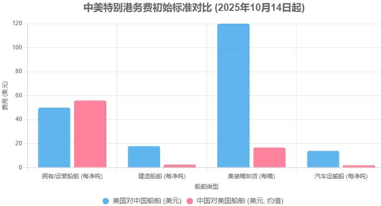 中国实体拥有或运营的船舶:每净吨50美元。中国建造的船舶:每净吨18美元,或每卸货集装箱120美元,取较高者。汽车运输船或滚装船:每净吨14美元。
