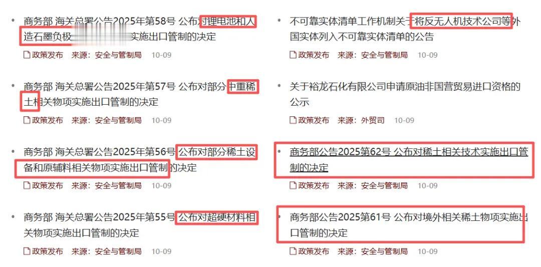 看看十月九号密集发布的这一连串公告,包括锂电池及锂电池技术,人造石墨负极材料及相关物项,反无人机技术、超硬材料等等一系列产品和技术,连环反制。