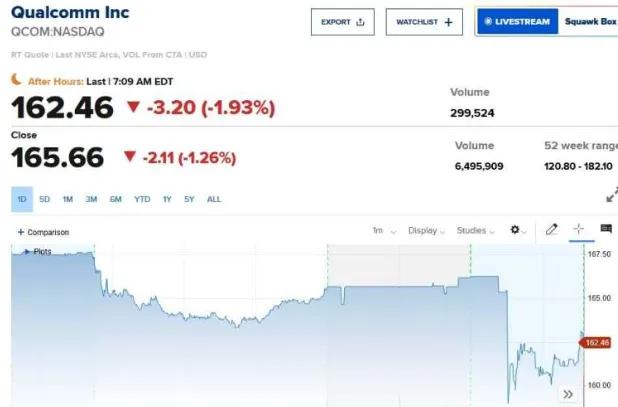 高通挥舞着专利大棒,在国内吃的盆满钵满,现在到了吐出来的时候了。高通股价盘前应声下跌。