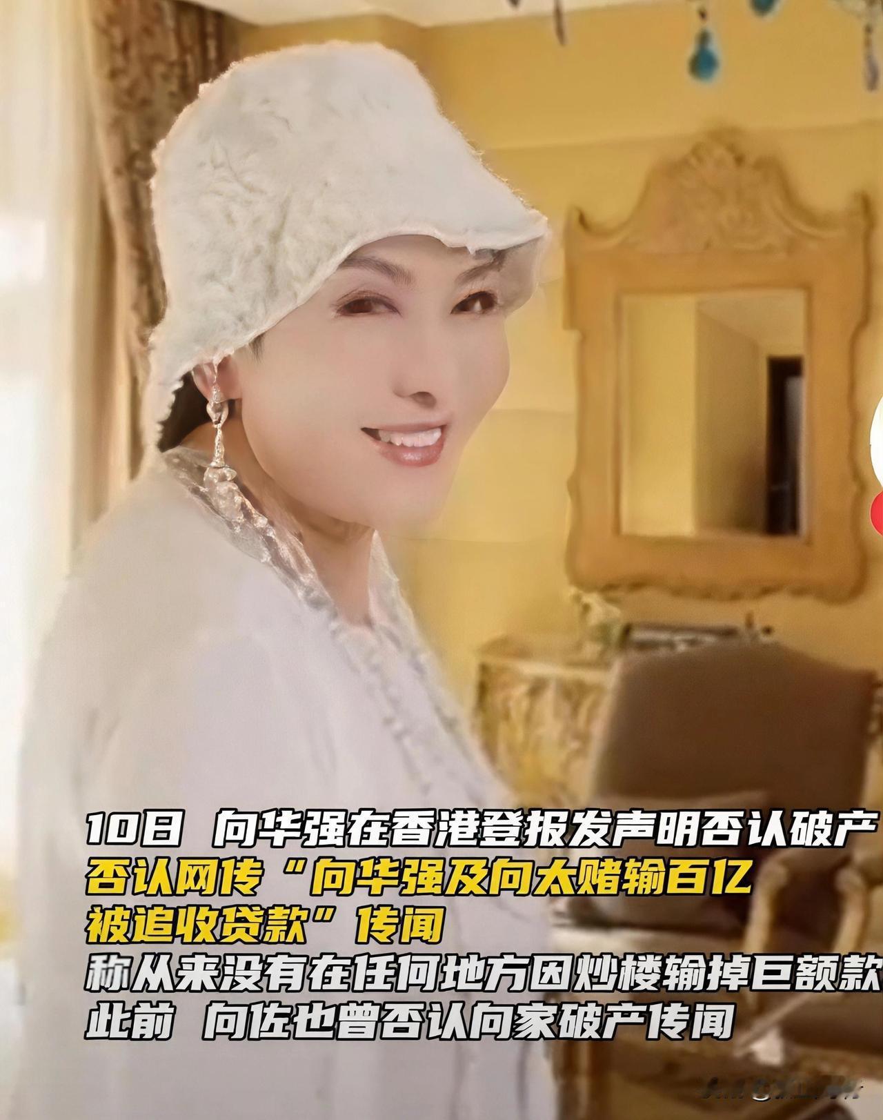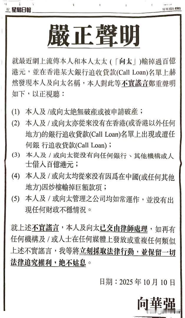 向华强夫妇近日以其鲜明的态度发布声明,向公众表明:对于恶意谣言,法律比任何澄清都更具有力的回应。 向华强夫妇否认破产传闻 此次向华强发声明辟谣,法律维权胜于雄辩,豪门是非多,但法律的铁拳从不看他人的下菜碟。 10月10日,这位香港电影出品人、中国星集团董事会主席在香港报纸头版公开发表声明,断然否认了近期网络上流传的关于他和妻子陈岚“输掉百亿港元”、“被银行追收贷款”等破产传闻。 在声明中,向华强明确列出了五点澄清:绝无破产或被申请破产、从未被任何银行追收贷款、没有借入百亿港元、从未因炒楼输掉巨额款项、管理公司均如常运作。 今年2月18日,向太陈岚的开年首播一度登上带货榜总榜第一,成绩亮眼。随后,她推出了标价599元(券后399元)的线上课程《向太向上闺蜜圈》,主打“链接高质量圈层”,截至2025年9月中旬已售出超7500份,销售额约300万元。 可能是这种从“豪门阔太”到“带货主播”的形象转变,让部分网友产生了猜测。 有人质疑:“真正的豪门闺蜜,可不是花399元就能当上的”。向太在直播间卖课的行为,被一些人解读为“财务紧张”的信号。 面对愈演愈烈的谣言,向家并没有沉默。在向华强发布正式声明前,向太陈岚就曾于9月28日晚在直播间直接回应破产传闻。 她当时言辞坚定地表示:“我现在养着一千多名员工,珠宝豪宅都还在,哪来的破产?这些造谣的,就是蹭流量。” 更值得注意的是,向华强夫妇不仅发表了声明,还已经采取了法律行动。 根据香港商报的报道,向华强在记者会中明确指出,这次事件涉及YouTube频道“升旗易得道”蔡明达,他已经出律师信告知该平台。 从公开信息来看,向家的商业版图并非如谣言所述陷入困境。事实上,向华强在声明中特别强调,“本人及/或向太管理之公司均如常运作,并未出现任何财政不稳情况。” 这一说法在向太之前的回应中得到了印证,她提到家族企业仍持续养着一千多名员工。对于直播带货这一引发猜测的举动,业内人士分析,这更像是向家主动的商业布局而非被动自救。 在当今传统产业增长乏力的背景下,向太与向佐凭借“豪门母子”的独特风格切入直播赛道,通过颠覆形象制造话题,进而实现商业转化。 从向太在直播间直言“养着一千多名员工,珠宝豪宅都还在”,到向华强登报发布五点正式声明,向家的回应尽显底气。 谣言往往止于智者,但有时更需要止于法律。当豪门光环遇上网络流言,向华强夫妇选择用法律武器维护名誉,这比任何华丽的辩解都更有力量。 【注】图片及参考信息来源 哈尔滨日报