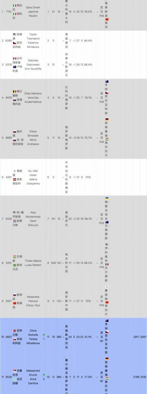 别忘了咱们还有球员有望晋级WTA年终总决赛…… 郭涵煜/帕诺娃即时冠军排名No.9,前五已经确定入围了,还剩三个席位。