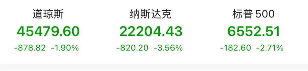 美东时间周五,美股遭遇“黑色星期五”:美股三大指数高开后盘中跳水,跌幅持续扩大,最终以三大指数集体收跌,且标普500指数和纳指均创下4月以来最大单日跌幅收尾。具体来看,标普500指数跌2.71%,报6552.51点;纳斯达克综合指数跌3.56%,报22204.43点;道琼斯指数跌1.9%,报45479.6点。
