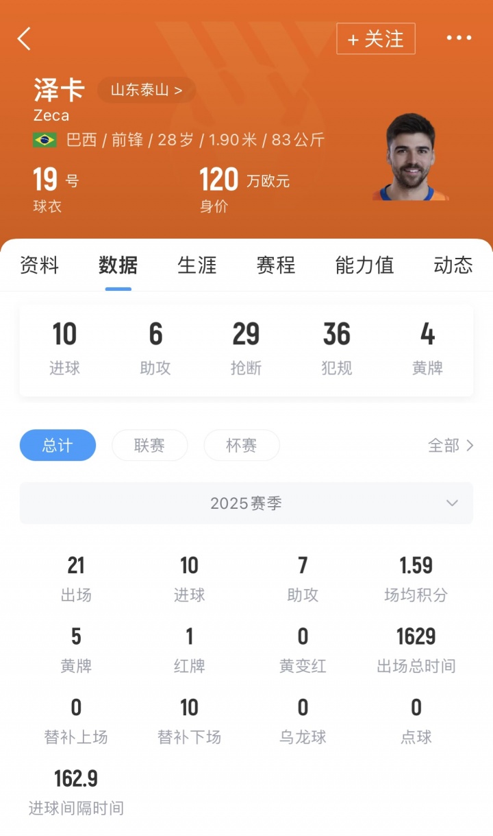 2024年加盟山东后,泽卡首个赛季遭遇伤病困扰,2025年他终于迎来稳定的出场,21场比赛贡献10球7助。