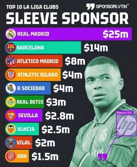西甲中小球队的球衣“广告位”价值远逊于英超。