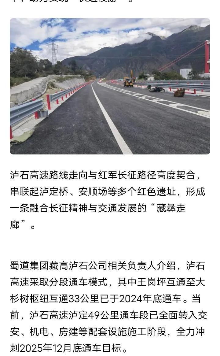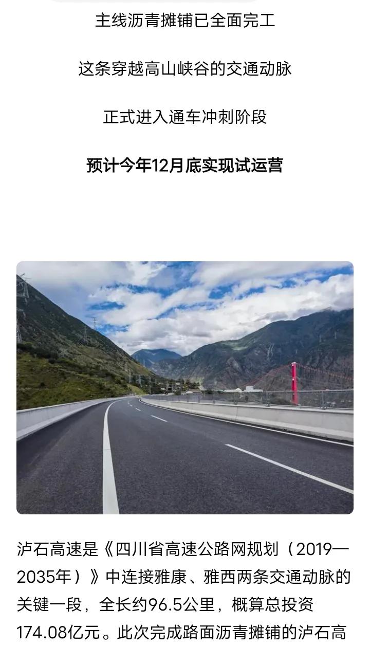 好消息,甘孜州泸定至雅安石棉的泸石高速即将于12月全线建成通车,目前全线沥青已经铺设完成,正在最后的收尾工作,泸石高速通车后乐山金口河和西昌市等地开车来往康定和泸定等地将更加便捷,比走雅安绕行雅叶高速至少要快半小时,泸石高速全长约82公里,其中石棉段的33公里已于2024年底建成通车,起于石棉县东南部大杉树枢纽接G5京昆高速,止于泸定县咋里村附近接G4218雅叶高速,沿途主要在德威、德妥、王岗坪、安顺场等地附近设互通收费站,双向四车道,设计时速80公里每小时,全线桥隧比高达80%以上,建设难度较大,全线有4公里长的海螺沟隧道和5.3公里长的胜利隧道,泸石高速建成后将极大的方便周边区县和沿途乡镇出行,泸定开车来往石棉将只需1小时左右比现在走217省道更加安全顺畅,对周边的旅游业发展也能起到重要的作用。