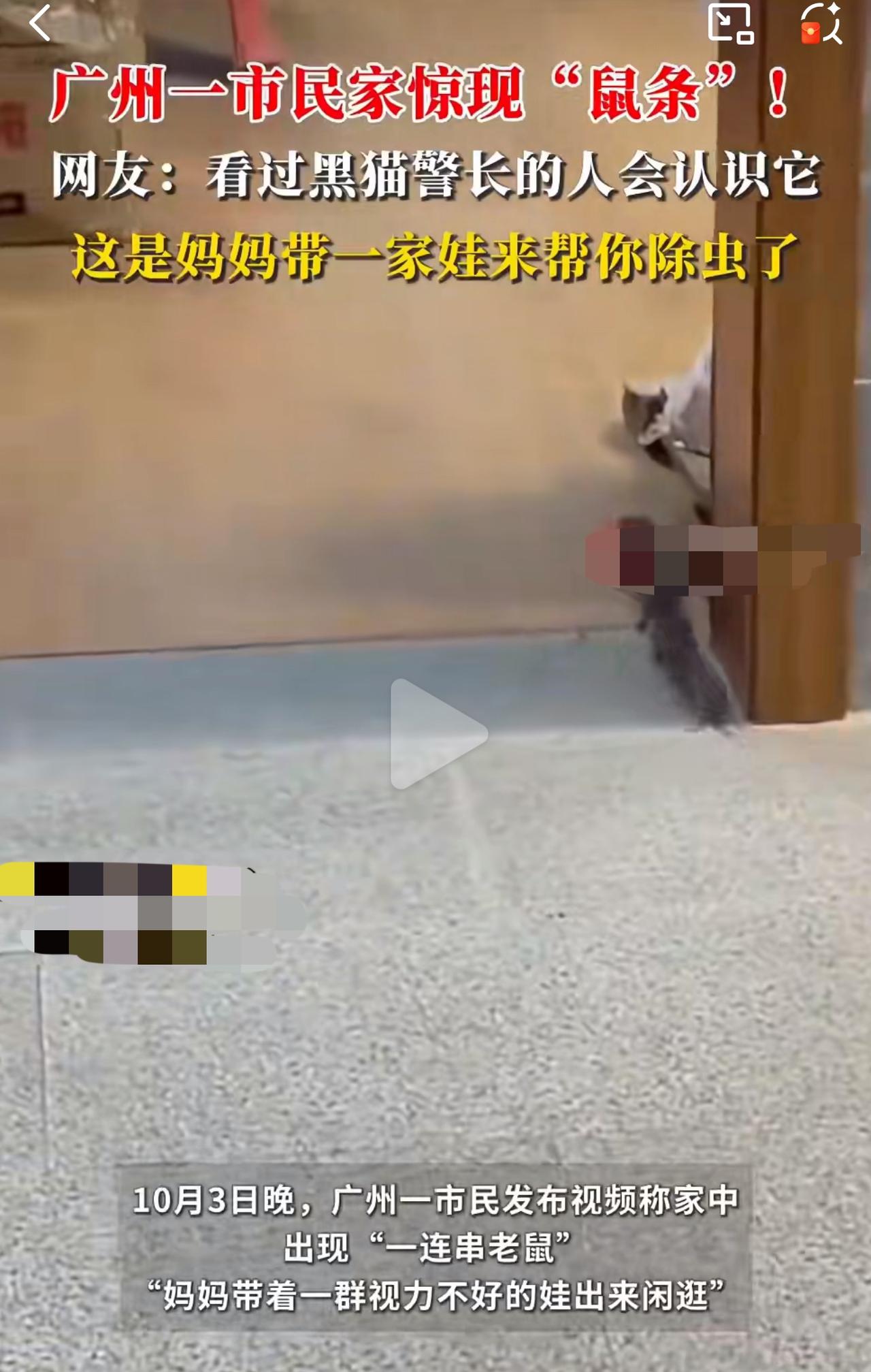 10月3日晚间,广州一位市民在家中意外撞见一幕令其哭笑不得的场景,随即用手机记录下来发布到社交平台。 视频画面中,昏暗的地面上有一串黑影正缓慢移动——一只体型稍大的老鼠走在最前方,身后紧跟着数只身形小巧的幼鼠,它们几乎首尾相接,沿着固定路线在家中地面"闲逛"。拍摄者在视频配文中描述,这像是"鼠妈妈带着一群还没长好视力的孩子出门",幼鼠们紧紧跟随着前方的"引路者",即便遇到地面轻微凸起,也只是短暂停顿后继续跟队前行。 这段视频很快引发网友讨论。有网友留言表示,看到这列队而行的鼠群,瞬间想起《黑猫警长》里的经典画面,"小时候看动画就见过类似的场景,没想到现实里真能碰到";也有网友调侃,"这鼠妈妈还挺有组织纪律性,生怕孩子丢了"。 拍摄者后续补充,发现鼠群后并未立即驱赶,而是先拍下视频,随后用粘鼠板和捕鼠笼进行处理,目前已将鼠群清理完毕。不少网友在评论区分享自家曾遇到的类似情况,有人建议"及时封堵家中缝隙,避免老鼠筑巢",也有人感慨"城市里的小动物们,生存方式还挺有意思"。