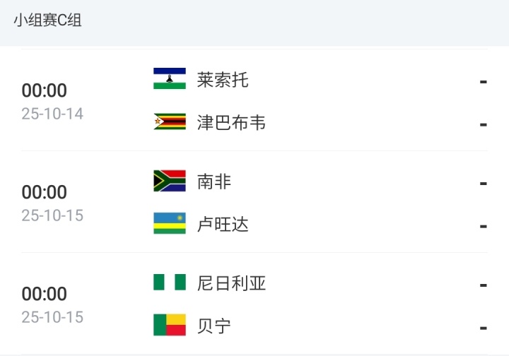 目前C组积分榜上,贝宁2分领跑;南非因派出违规球员,对阵莱索托的比赛被判0-3负,随后又遭垫底队逼平,目前落后2分;坐拥奥斯梅恩、卢克曼、伊沃比等名将的尼日利亚落后3分。