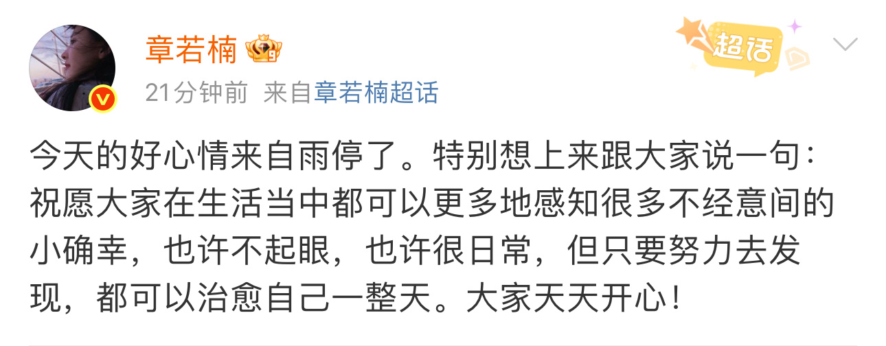 呜呜呜若楠宝宝[泪][泪][泪]章若楠今天的好心情来自雨停了