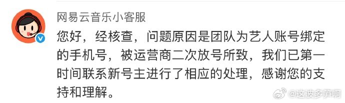 网易云客服回应:“该手机号是团队为艺人账号绑定的手机号,被运营商二次放号所致”!!