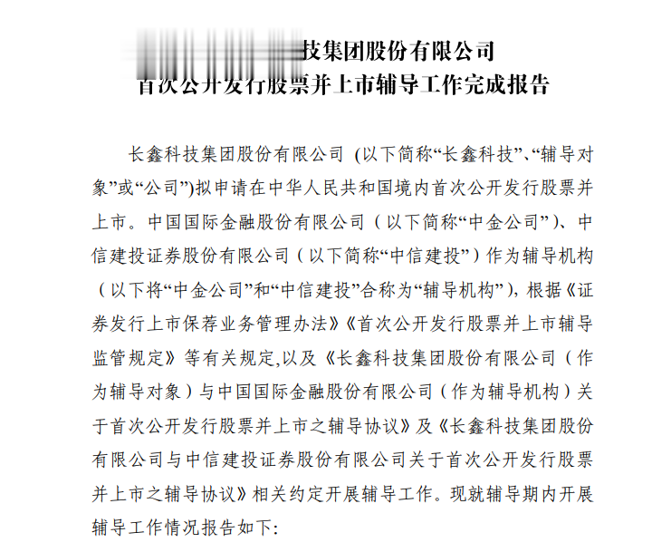 辅导报告显示,长鑫科技上市辅导于7月7日启动,由中金公司与中信建投证券联合开展,辅导时间自7月至9月。