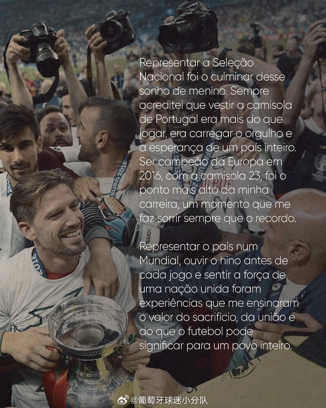 代表国家队是每个男人最大的梦想。我一直认为,穿葡萄牙国家队的球衣不仅仅是踢一场比赛,它更承载着整个国家的骄傲和希望。2016年成为欧洲杯冠军,23号球衣是我职业生涯的最高点,每次想起它时,这个时刻都会让我微笑。代表国家队出战世界杯,在每场比赛前奏响国歌,感受球迷的欢呼声,这些经历教会了我牺牲、团结的价值,以及足球对人民意味着什么。