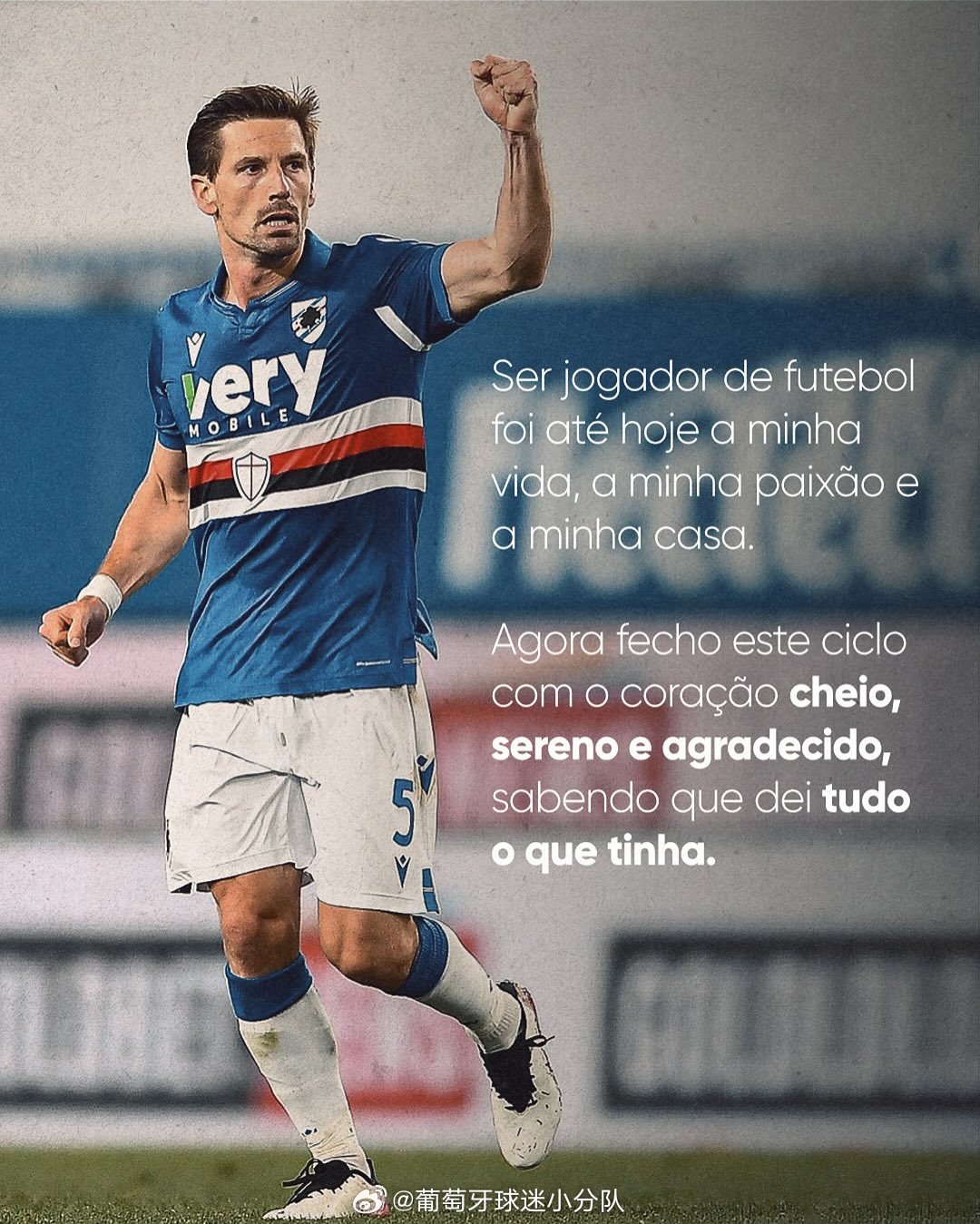 直到今天,作为一名足球运动员一直是我的生活、我的激情和我的全部。现在,我以一颗饱满、宁静和感恩的心结束这个阶段,我知道我付出了我所拥有的一切。
