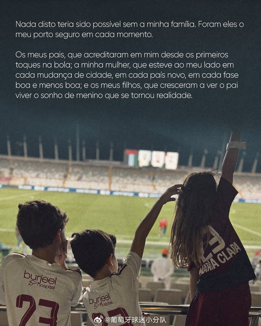 没有我的家人,这一切都不可能实现,他们一直是我的避风港。我的父母,他们从第一次接触足球就相信我;我的妻子,在每一个城市、每一个国家,在每一个好的和不好的阶段,她都在我身边;还有我的孩子,他们看着父亲实现男孩的梦想长大。当周围的一切不确定时,他们给了我平衡、力量和理智。这条路是我的,但也是他们的。