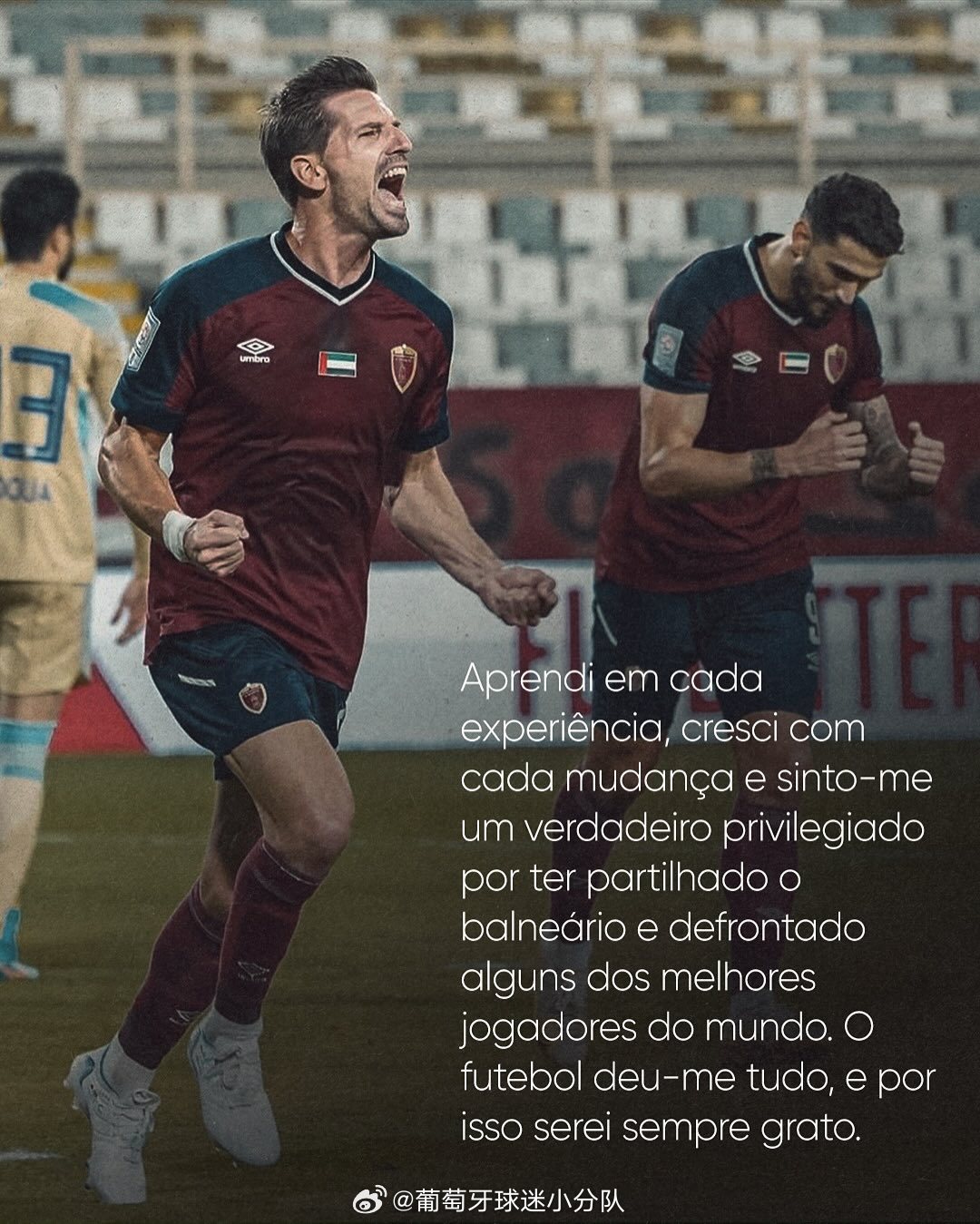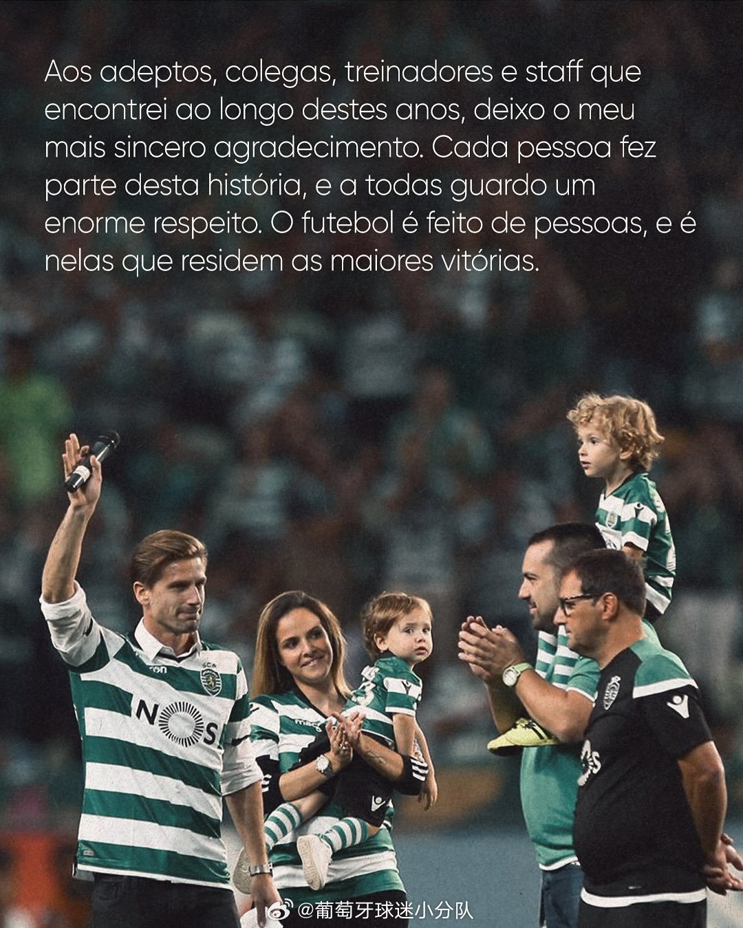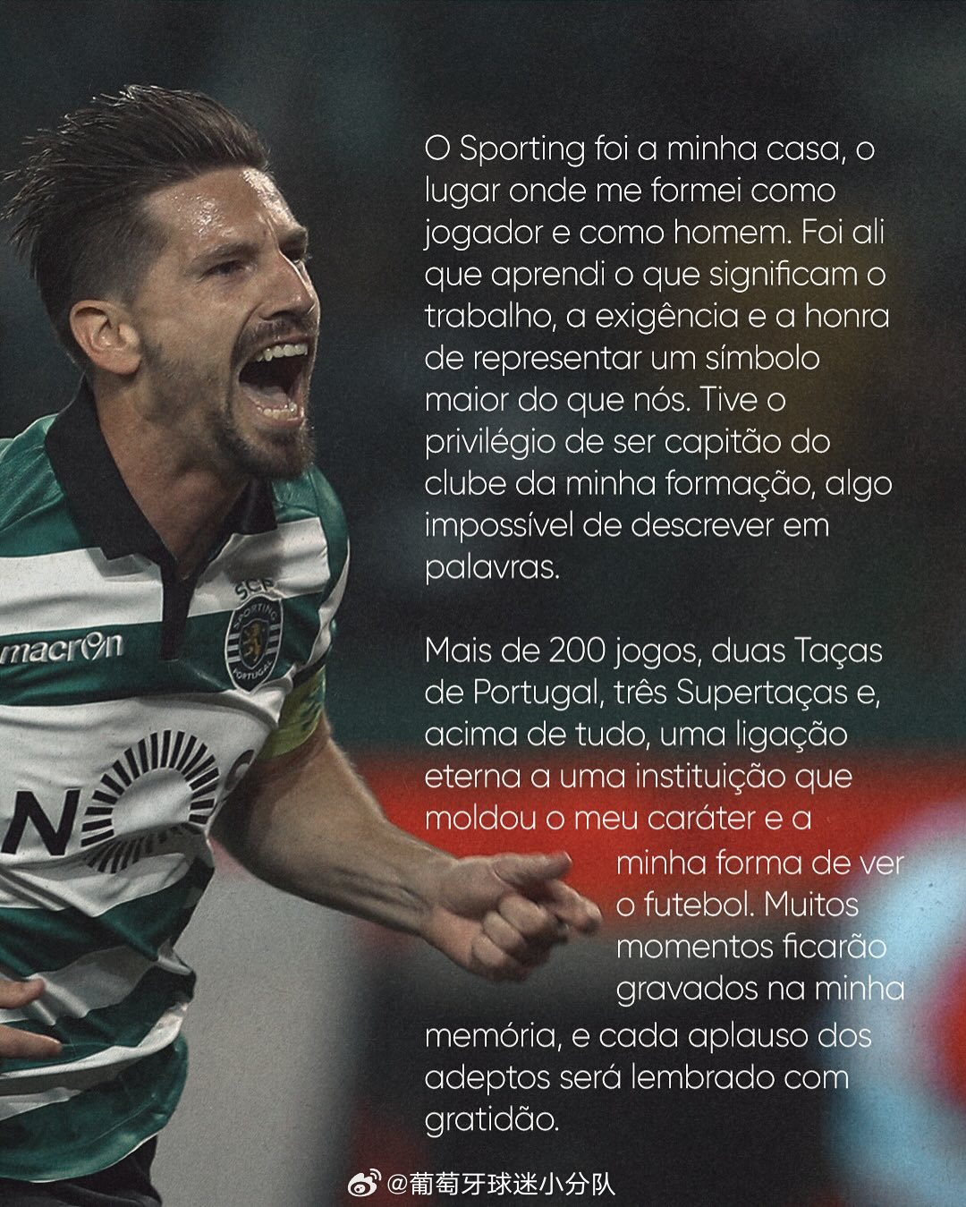 葡萄牙体育是我的家,是我以球员和男人的身份成长的地方。正是在那里,我了解到代表一个伟大球队去争得荣誉意味着什么。我有幸成为这支球队的队长,这是无法用语言描述的。超过200场比赛,两届葡萄牙杯,三届超级杯,最重要的是,与塑造我性格的球队有永恒的联系。许多时刻将被储存在我的记忆,球迷的每一次掌声我都会被感激并记得。