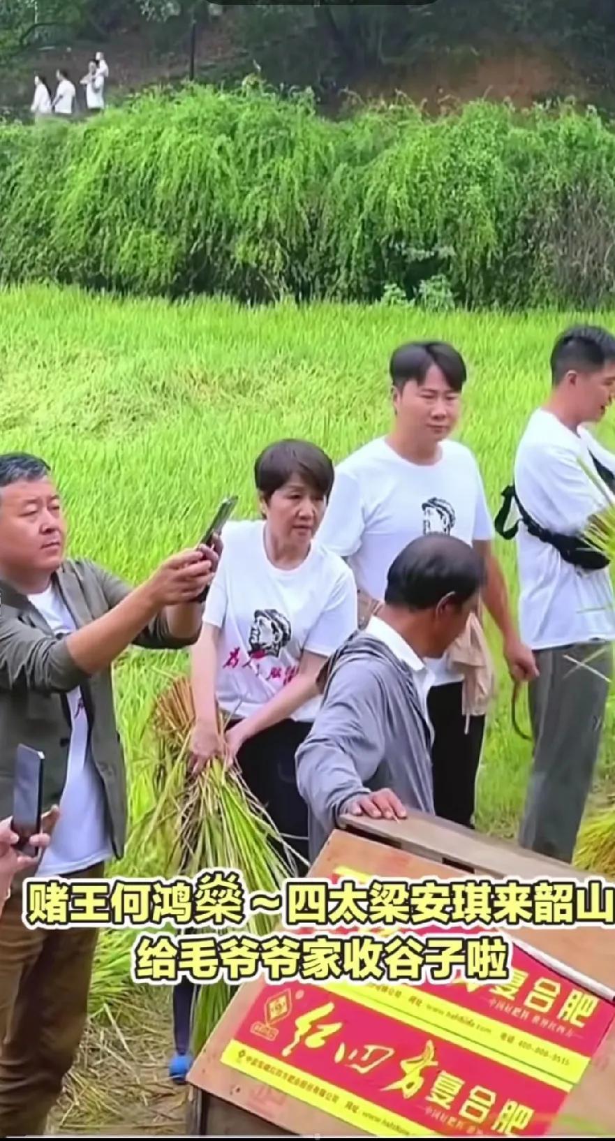有钱人体验生活,不说是赌王四太粱安琪,还以为是普通人,在收稻谷呢。