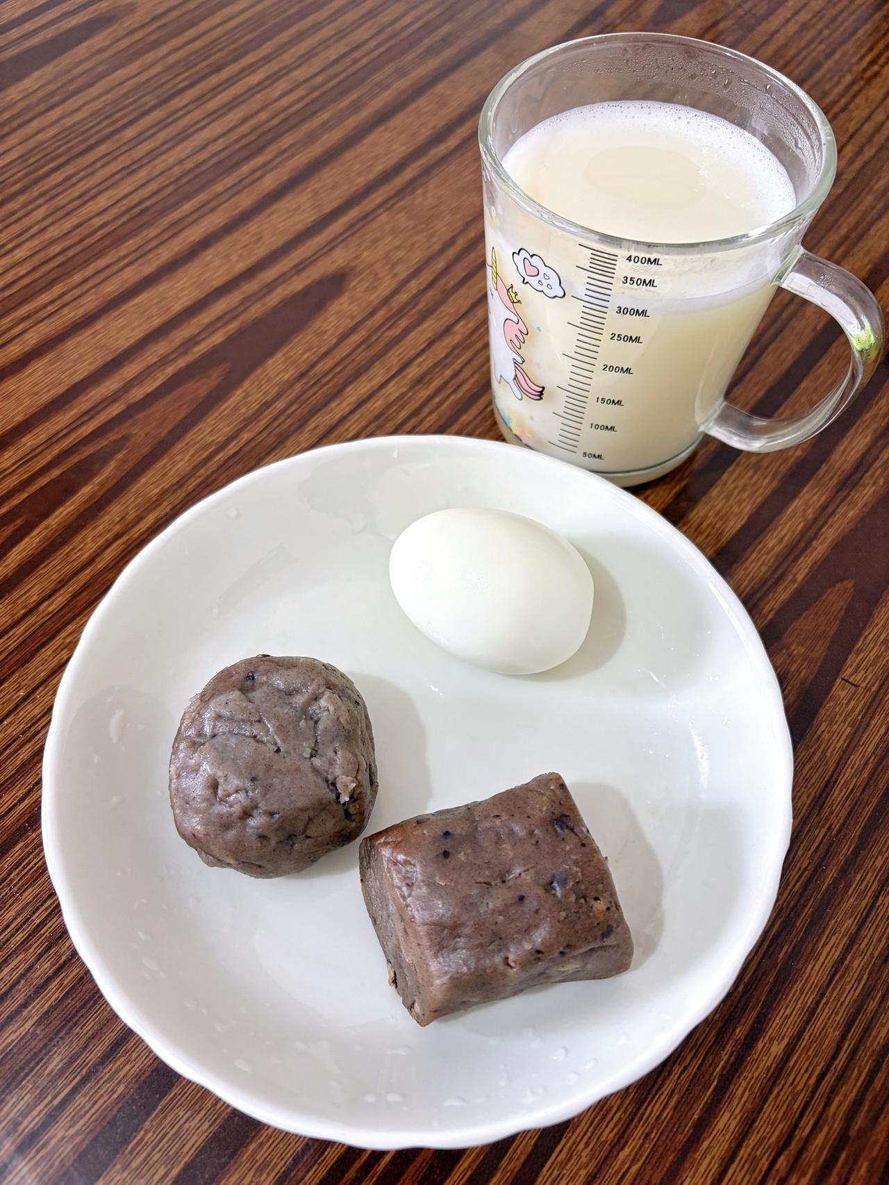 吃早餐了,姐妹们,今天吃:红豆荞麦馒头+鸡蛋+现磨豆浆