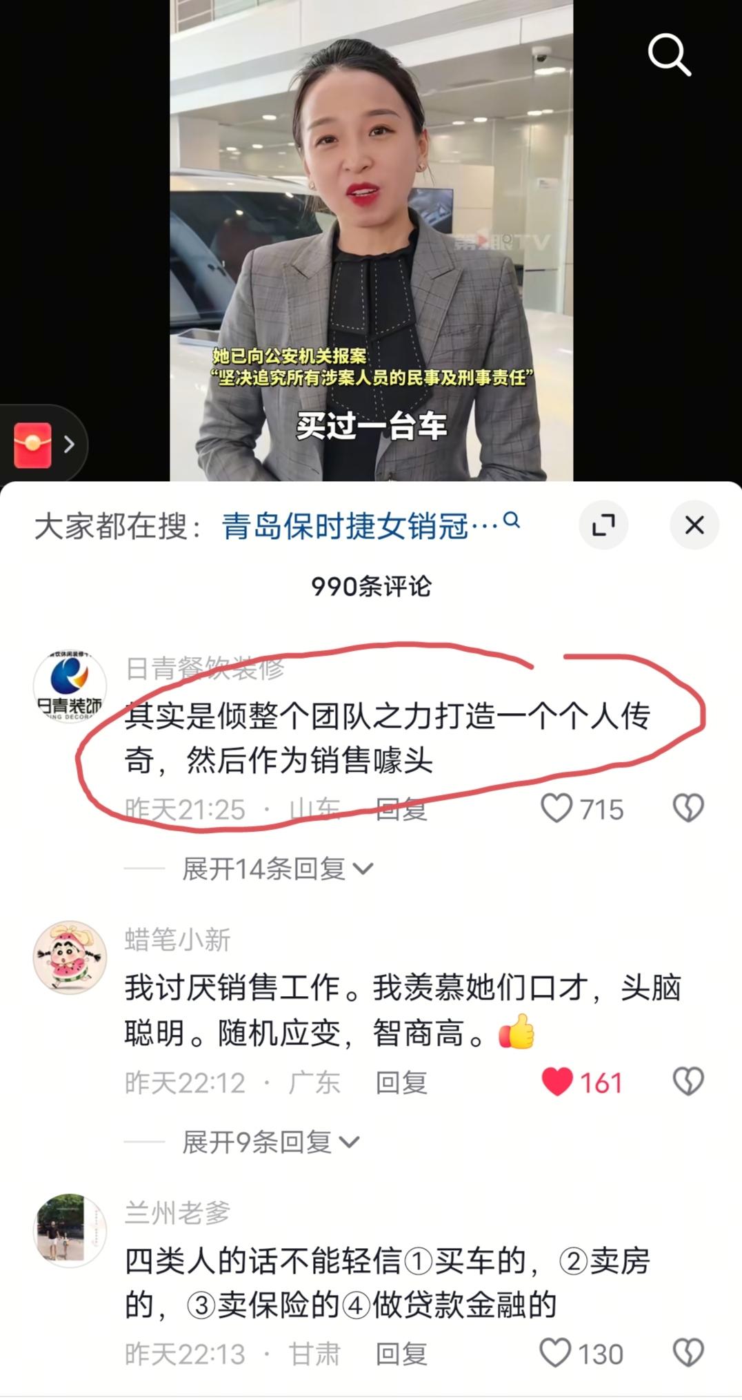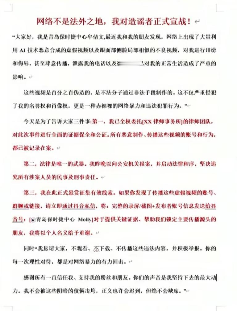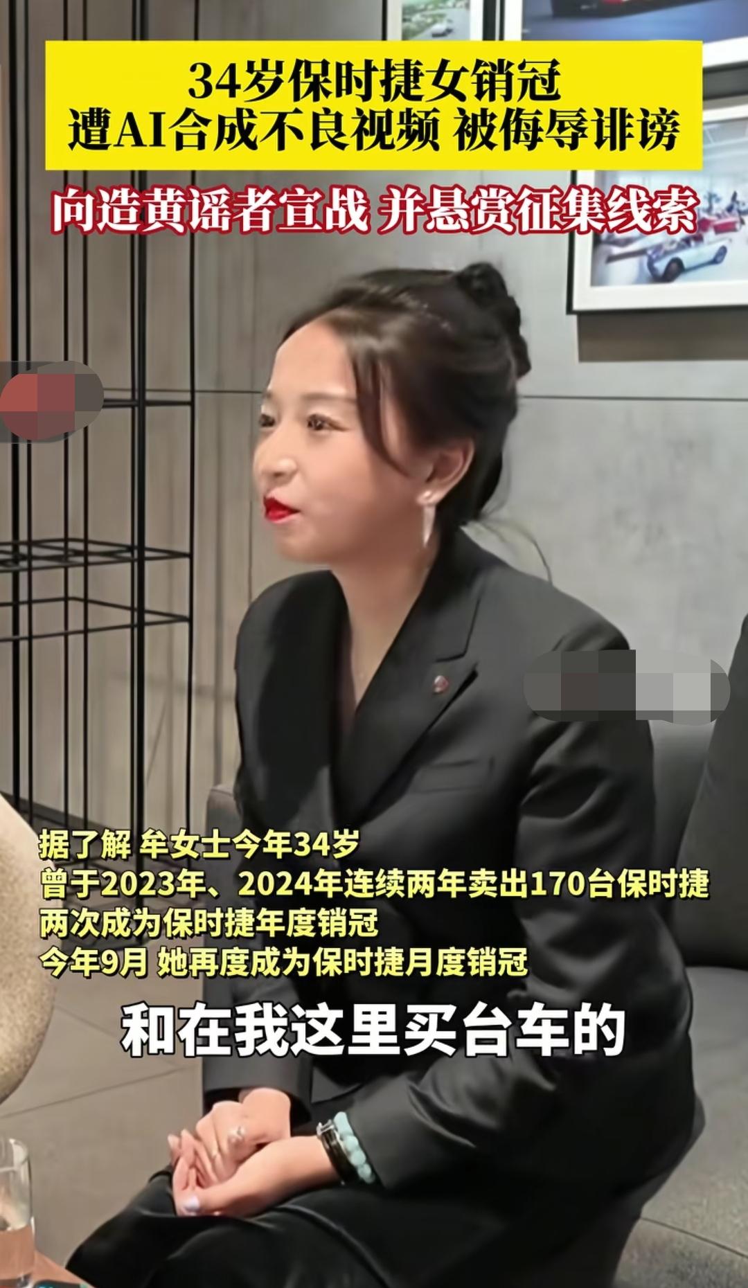 10月10日,青岛保时捷女销冠发文称:自己遭AI合成不良视频,对其进行诽谤和侮辱,甚至肆意传播…… 本人已声明:已报警,恳请大家不观看,不下载,不传播,并积极举报…… 评论区很多网友不是关注“ai合成不良视频”这件事情上,而是更多关注她如何成为“保时捷年度销冠”这件事情上,有很多网友表示:所谓的门店销冠,很多都是门店有意为之,是倾整个团队之力打造的,仅仅是一个销售噱头。 更有极个别网友猜测她此次的这个事情,也有可能是炒作。在我看来,这应该不至于,谁愿意为了炒作,抹黑造谣自己啊? 各位网友,你们怎么看?
