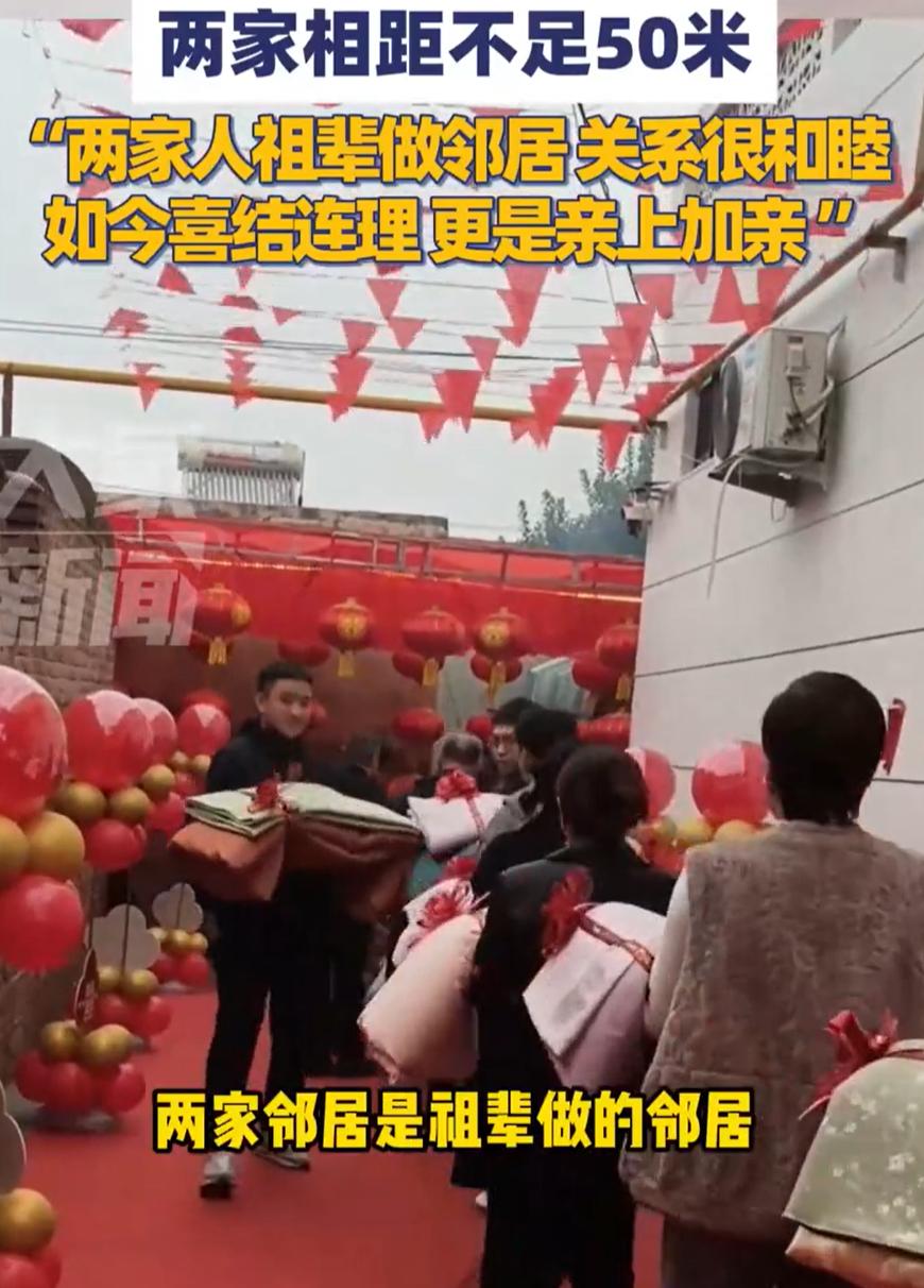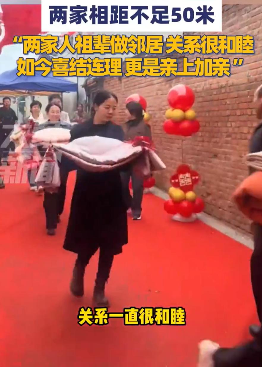 “这绝对是青梅竹马!”河北邢台,村里一对新人结婚,可两家人完全不用考虑接亲的问题,因为两家从祖辈就是邻居,相聚50都不到,出门就回娘家。网友:果然是近水楼台先得月! 婚礼那天,虽然两家离得实在太近,接亲这一步几乎可以省去,但该有的仪式感一点都没少。长长的红地毯从新郎家铺到了新娘家,把两户人家实实在在地连在了一起。路边扎着红气球,头顶飘着红彩旗,喜气一路蔓延。别人结婚可能只铺一小段路,他们倒好,直接把两家串了起来,像一条红色的纽带 村民邻居介绍,这两位亲家一点都陌生,两家距离不到50的米,从祖辈开始就做邻居,两个孩子也是一起长大的,现在他们喜结连理,更是亲上加亲 对此,有网友调侃说:这下过年探亲都不担心堵车了 其实这不只是一场婚礼,也不只是两家人的喜事。它让我们看到一种渐渐稀少的邻里关系,那种从小在一个院里长大,父母是邻居,孩子是玩伴,彼此见证着对方人生重要时刻的亲近 如今在城市里,很多人连对门住的是谁都不清楚。而这种长达几十年、跨越两代甚至三代人的相邻而居,在今天显得格外珍贵 他们不用经历远嫁的忐忑,不用适应陌生的环境,甚至回门都不用收拾行李。但这不代表感情会打折扣。正因为太熟悉,所以更懂得,更珍惜。从邻居变成一家人,不只是地理上的靠近,更是心贴得更近