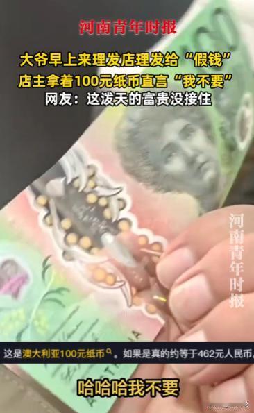 江苏徐州,一位大爷去理发店理发,可剪完付款后,却拿出一张印有外国人头像的绿色百元钞票, 店主一看,大爷这不是忽悠人的嘛,当场就拒绝了,事后还把视频发到了网上,可眼尖的网友一看,直呼店主亏大了,因为并不是假币,而是澳元! 当天,店里上午刚开门就迎来了一位老大爷。老师傅手法利索,没一会儿就理完了发。等到结账时,大爷从钱包里慢悠悠地掏出一张绿色的纸币,上面印着个外国人头像 他直接跟大爷说,这钱他收不了,请换一张。大爷也没多说什么,默默把钱收回去,改用手机付了款 事后老板觉得这事挺离谱,就拍视频发网上,还说大爷给了他一张熊假钱,可没想到,网友看完后提醒他,这张钱可不是假币,而是澳大利亚的真钞 有人指出,纸币左上角明明写着Australia,那是澳大利亚的英文 说起来,澳元的外形和触感确实和人民币完全不同,用的是特殊的塑料材质,看着花哨,其实是世界上防伪性能最强的纸币之一。按现在汇率算,100澳元差不多能换460多人民币。也就是说,老板不光没吃亏,还白白错过了一次“赚”小几百块的机会 不过调侃归调侃,店家做法也没错。毕竟谁在日常生活里能随手认出澳元?对大多数人来说,只要不是人民币,第一反应就是假币。理发店又不是银行,老板的选择其实很正常 真要是他当时收下这钱,后面麻烦也可能不小。假如那张澳元本来是大爷误拿的,等家人发现钱少了一张,再找上门来,店家还得原封不动退回去,白折腾一场。更何况,店家就算真想换成人民币,还得跑银行填表排队