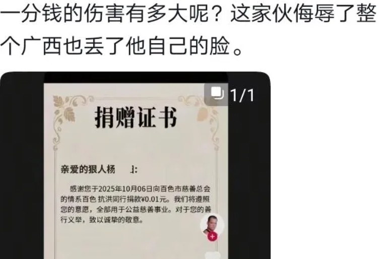 为广西百色抗洪捐款1分钱,23万粉丝博主发声:希望大家嘴下留情! 捐一分线本无可厚非,但你作为一个网红,并且还故意晒出来,那明显是一种炒作,不管别人是褒是贬,他的目的达到了。 连捐款都拿出来炒作,这样的网红应该封杀。 真去捐款不说多少一百块还是能拿出来的,再不济几块十块的就一顿饭钱,绝对不会捐什么一分钱,给我感觉捐一分钱就不是献爱心了。 明摆着就是恶心人来的,这种博眼球的操作希望严厉打击!