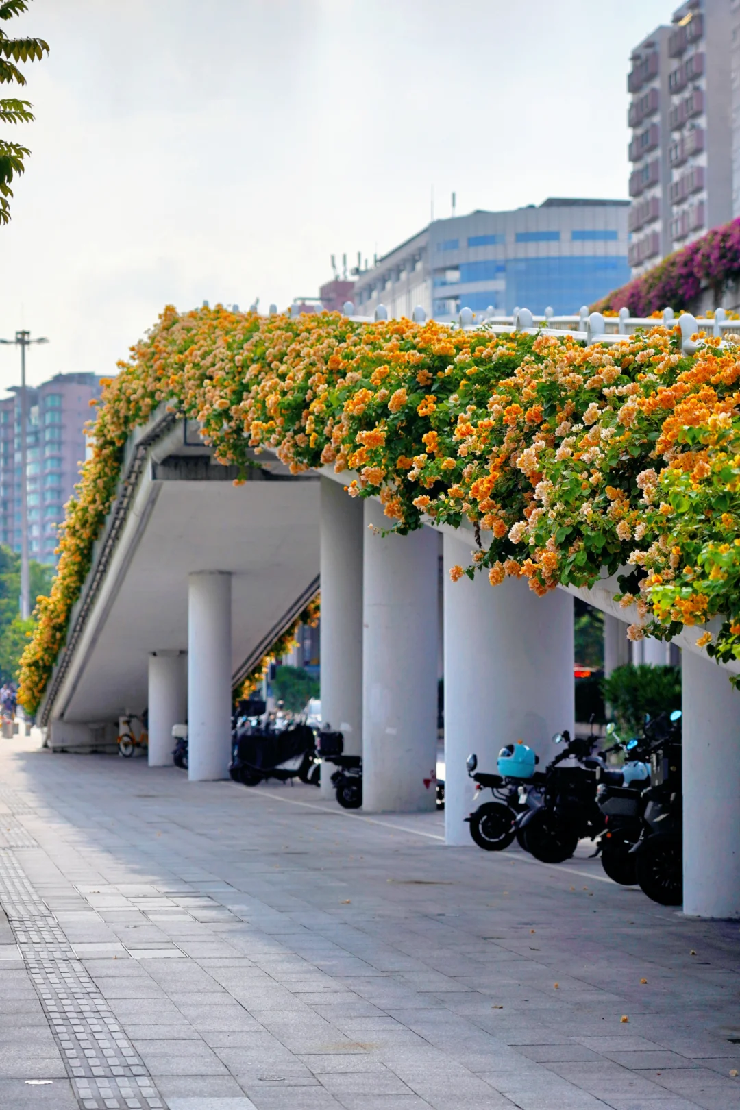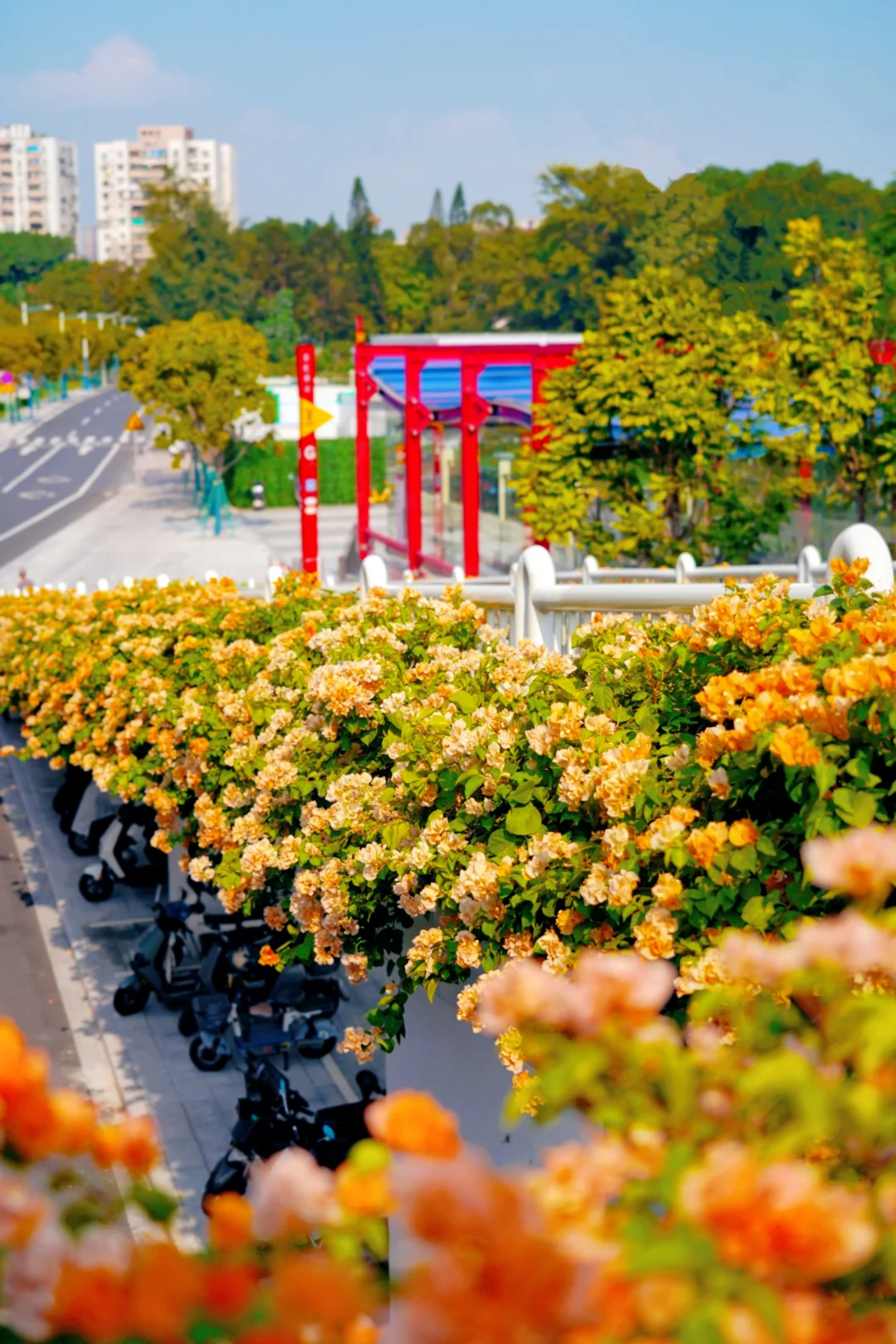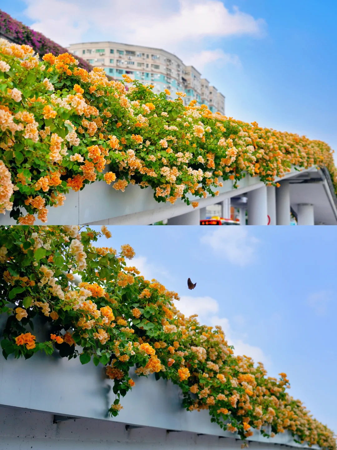 旅游编辑部 不愧是花城广州 随随便便走出个地铁站 就能邂逅一个美得像婚礼现场的鲜花天桥! 微风阳光下花瓣飞舞,很是梦幻! - 广州荔湾彩虹桥🌈地铁站出来就是 这座天桥的黄色三角梅正是盛花期 重点是没人啊!想怎么拍都行~ 照片是今天2025.10.11上午拍的 拍完这里,就能沿着湖畔栈道去流花湖玩了 - 🚇地铁:8/11号线彩虹桥地铁站,出站就是 📸附近景点:流花湖公园