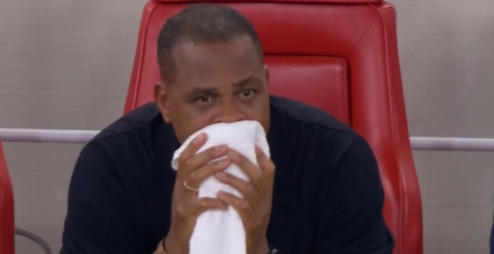 随后,他就一直坐在教练席上不断地用毛巾抹脸,眼眶泛红,场上队员和工作人员和马宁发生冲突他也只是看着。