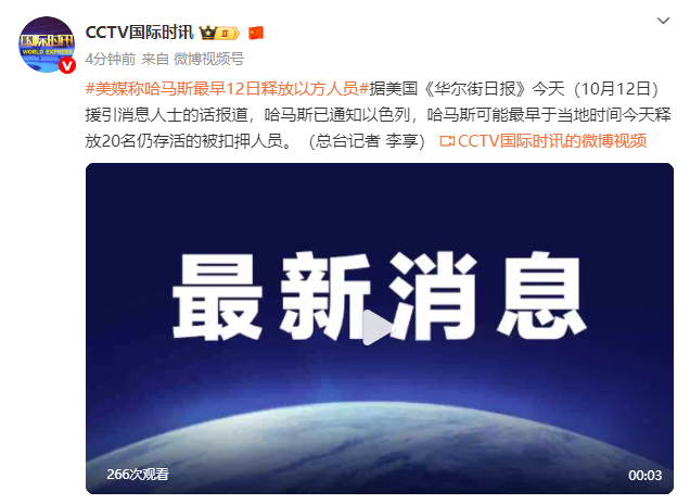 据美国《华尔街日报》今天(10月12日)援引消息人士的话报道,哈马斯已通知以色列,哈马斯可能最早于当地时间今天释放20名仍存活的被扣押人员。