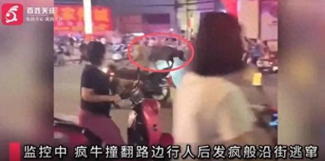 监控中,疯牛撞翻路边行人后发疯般沿街逃窜,众人仓促避让。有伤者被撞后躺地大声呼救,附近路人将其扶起并转移至安全区域。