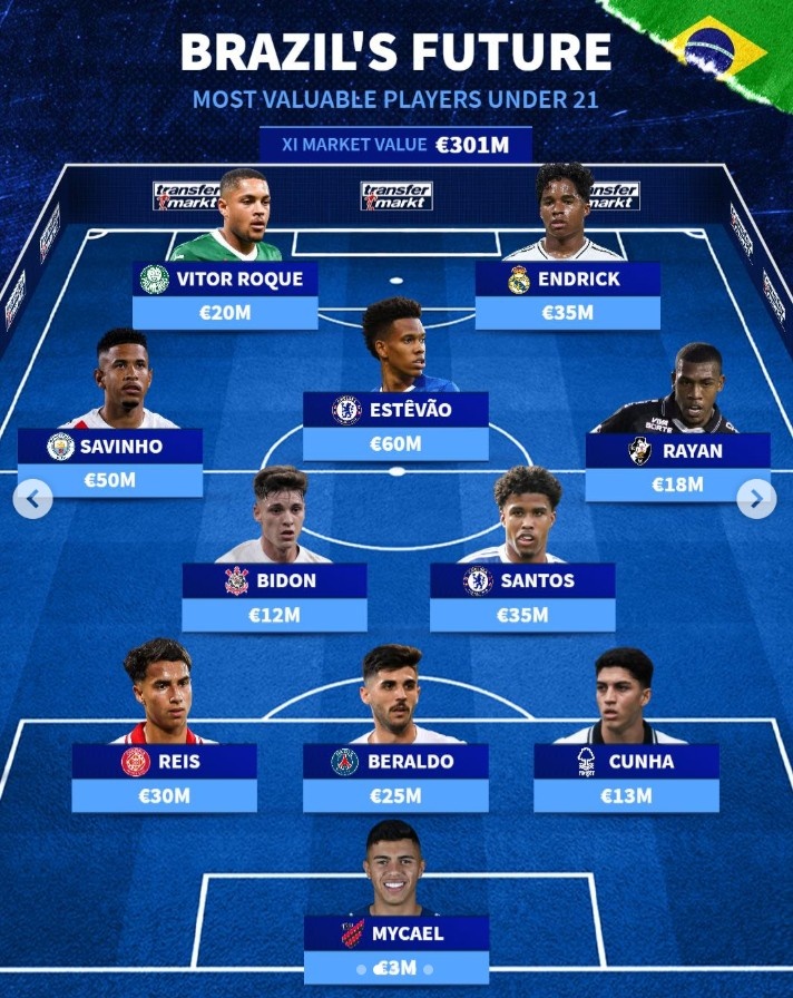 直播吧10月12日讯德转列出巴西U21最贵阵,埃斯特旺6000万欧最高,罗克和恩德里克突前,萨维尼奥在列,全队总身价3.01亿欧。