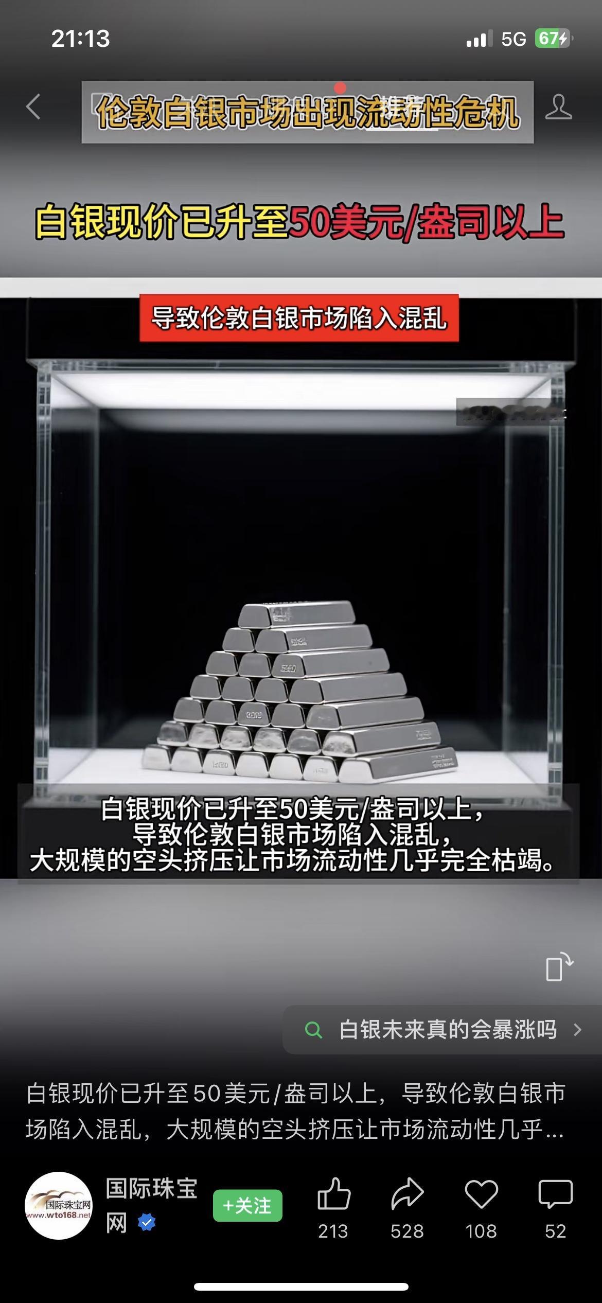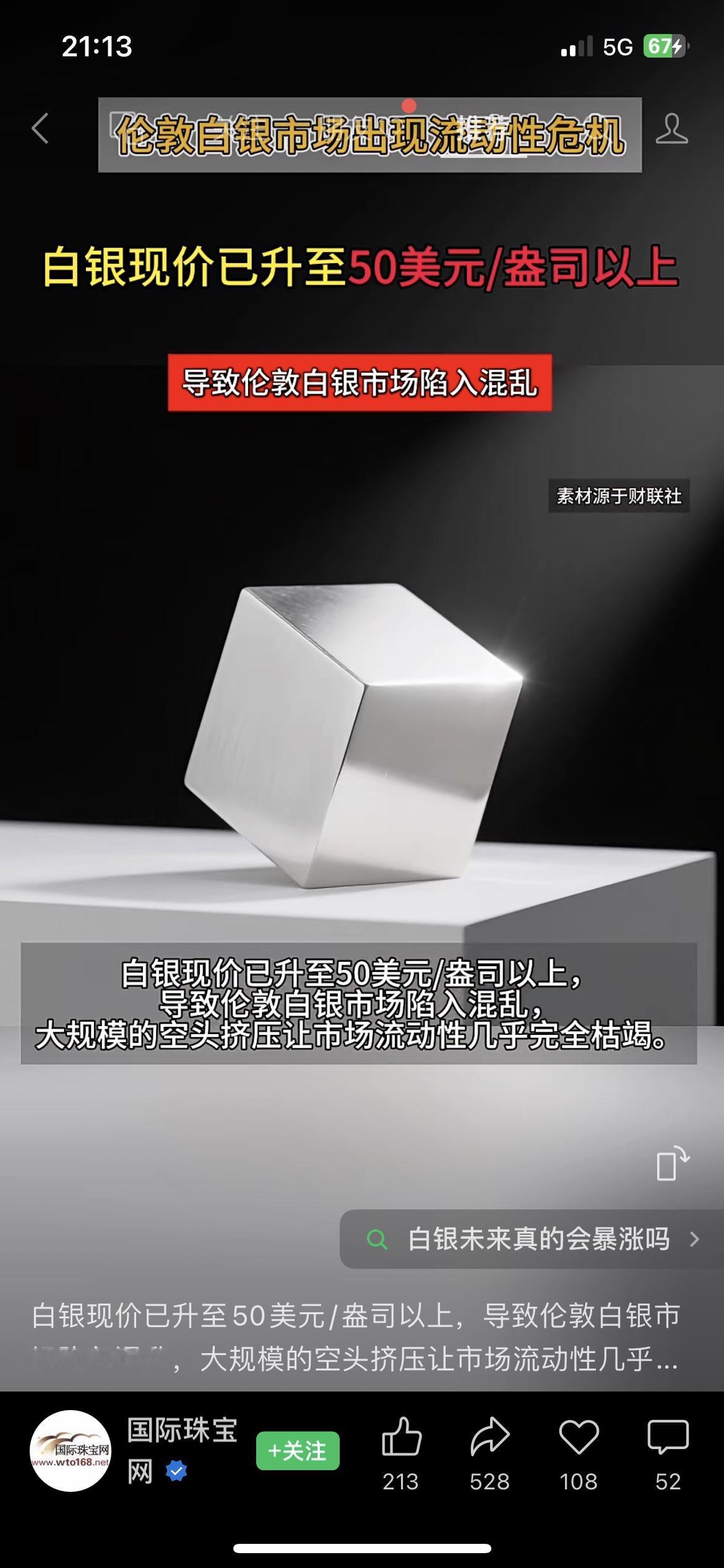 伦敦白银市场炸锅了!50美元/盎司还在涨,买了白银基金的我今晚睡不着了… 家人们!伦敦白银市场这波操作把我看懵了!现货直接飙到50美元/盎司以上,市场都乱成一锅粥了! 我前段时间在支付宝买的白银期货基金,今天打开一看直接懵了,这涨势也太猛了!据说伦敦那边都没银可交了,空头被按在地上摩擦,流动性都快枯竭了… 咱普通人不懂那些复杂的金融术语,但就知道手里的白银基金跟着蹭蹭涨,又激动又忐忑!这到底是天上掉馅饼,还是暴风雨前的平静啊? 有没有同样买了白银基金的朋友?你们现在啥心情?是拿着还是跑?来评论区聊聊,让我也取取经! 白银 期货 基金 伦敦白银 投资黄金白银价格 白银 白银价格疯涨 白银黄金价格