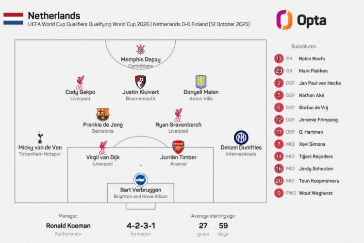 直播吧10月13日讯世预赛欧洲区小组赛,荷兰在主场迎战芬兰。本场比赛,荷兰再次排出了没有任何一名荷甲球员的首发阵容,这是橙衣军团今年第5次做出如此安排。此前,荷兰国家队所有年份没有排出荷甲球员的首发阵容也仅有5次而已。