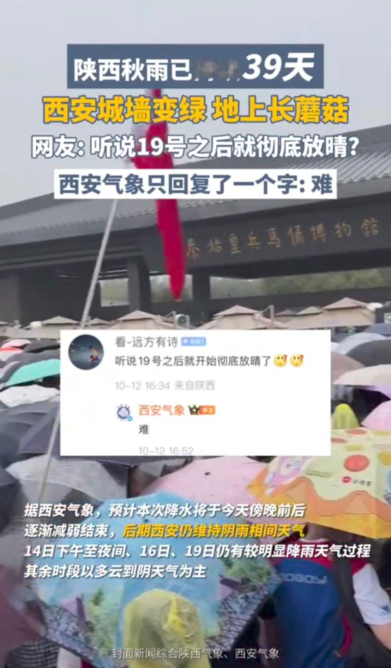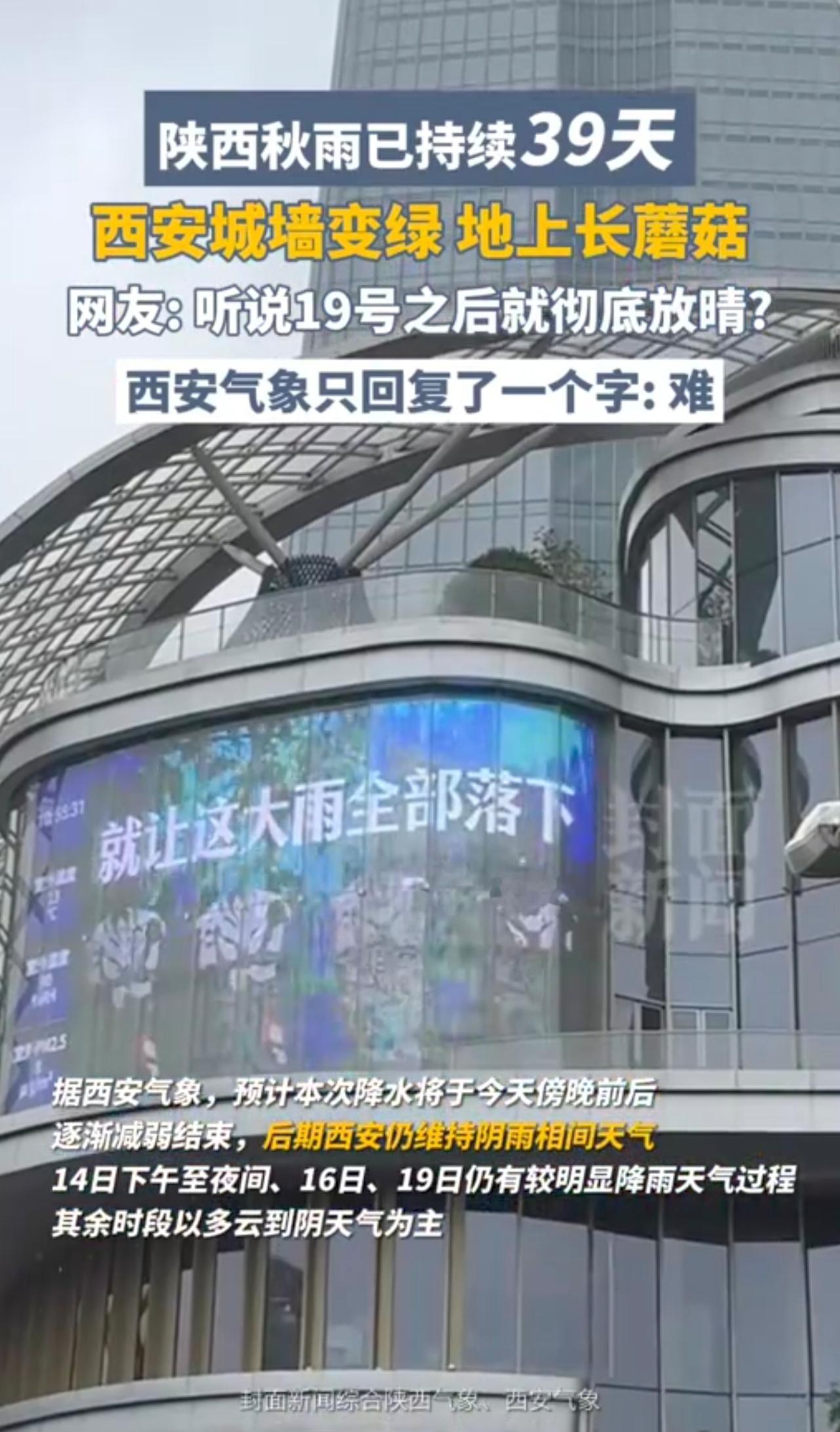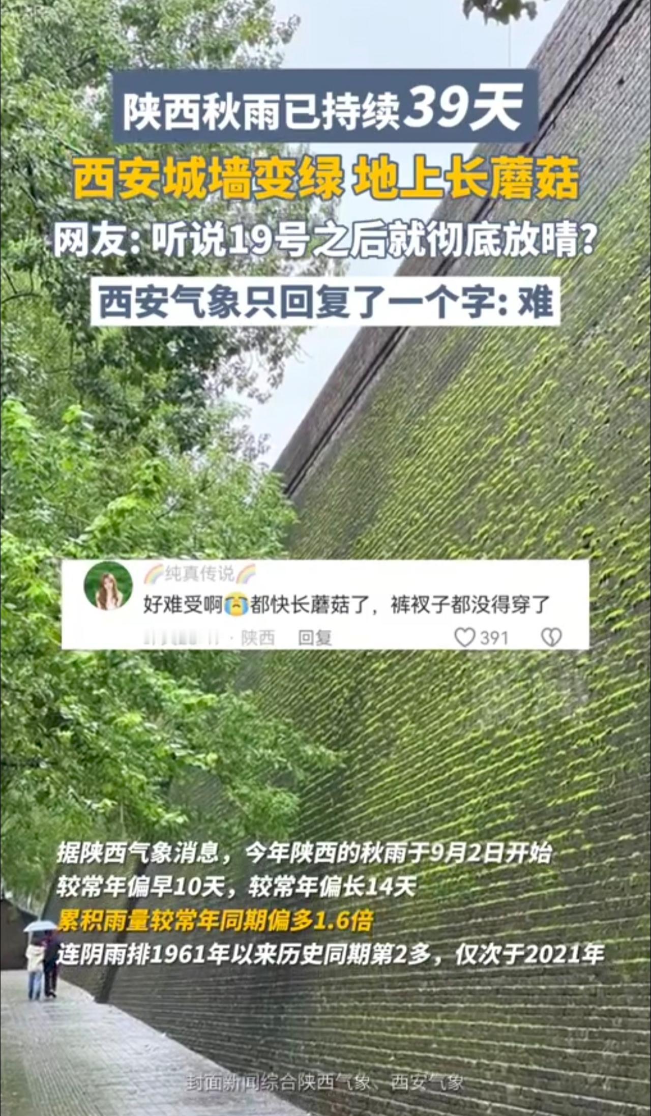 陕西秋雨已持续39天,西安城墙变绿、地上长蘑菇,网友: 听说19号之后就彻底放晴?西安气象只回复了一个字: 难[捂脸]