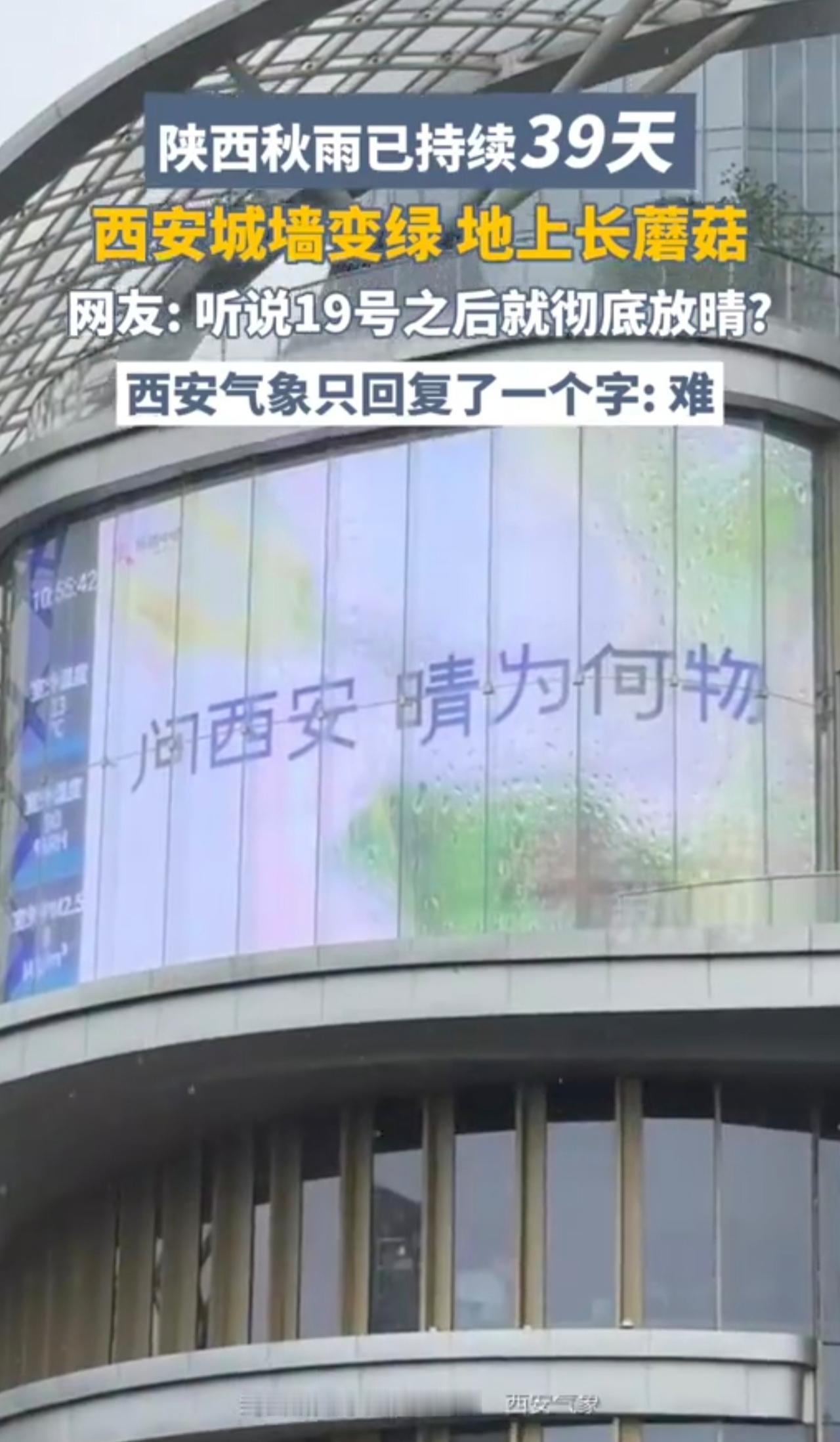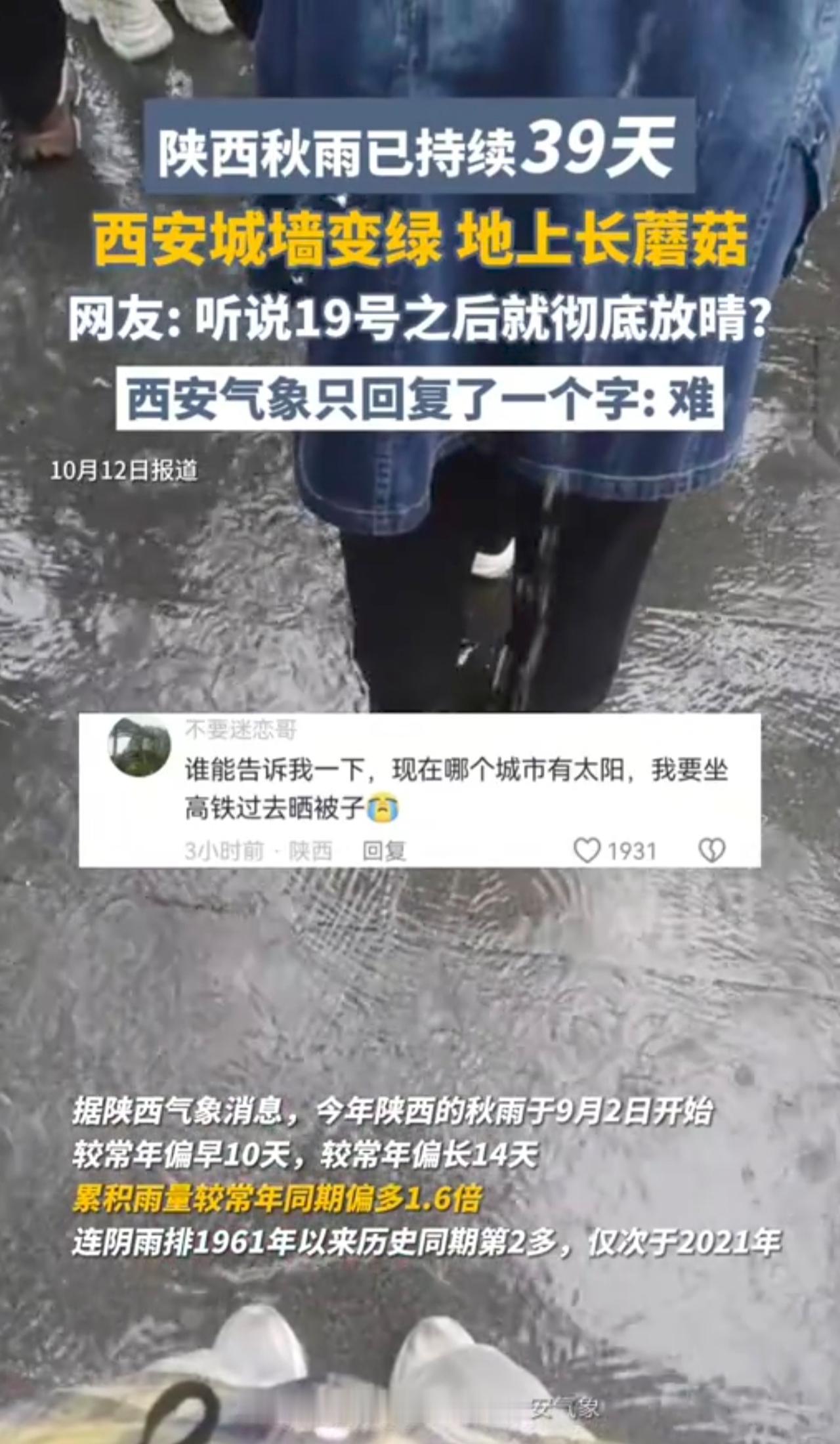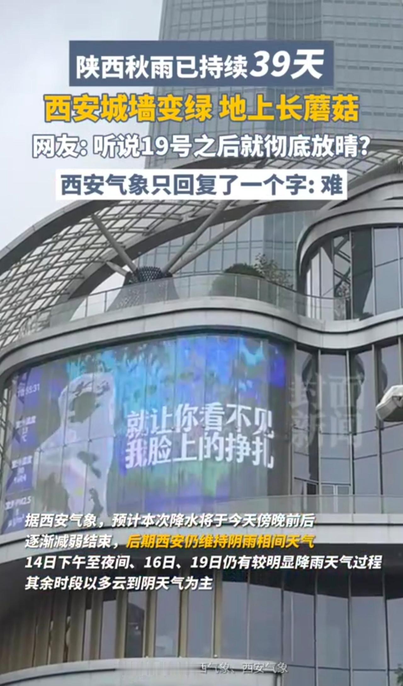 陕西秋雨已持续39天,西安城墙变绿、地上长蘑菇,网友: 听说19号之后就彻底放晴?西安气象只回复了一个字: 难[捂脸]