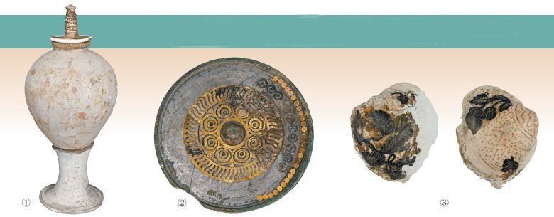 图(1)(2)(3)分别为张九龄夫人董韶容墓出土的陶塔式罐、金银平脱镜、胭脂盒(资料照片)。陕西省考古研究院供图