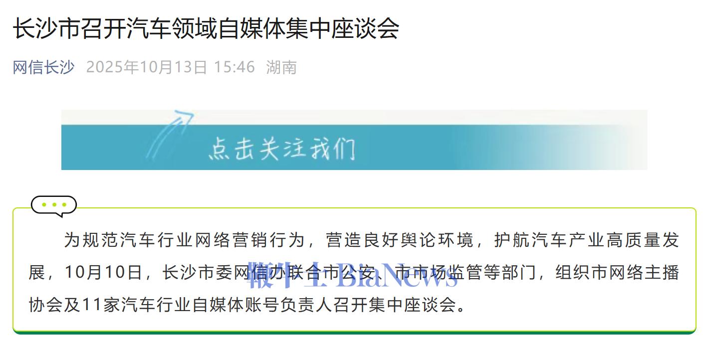 据“网信长沙”公众号,为规范汽车行业网络营销行为,营造良好舆论环境,护航汽车产业高质量发展,10月10日,长沙市委网信办联合市公安、市市场监管等部门,组织市网络主播协会及11家汽车行业自媒体账号负责人召开集中座谈会。
