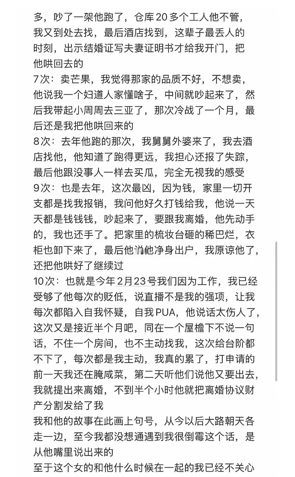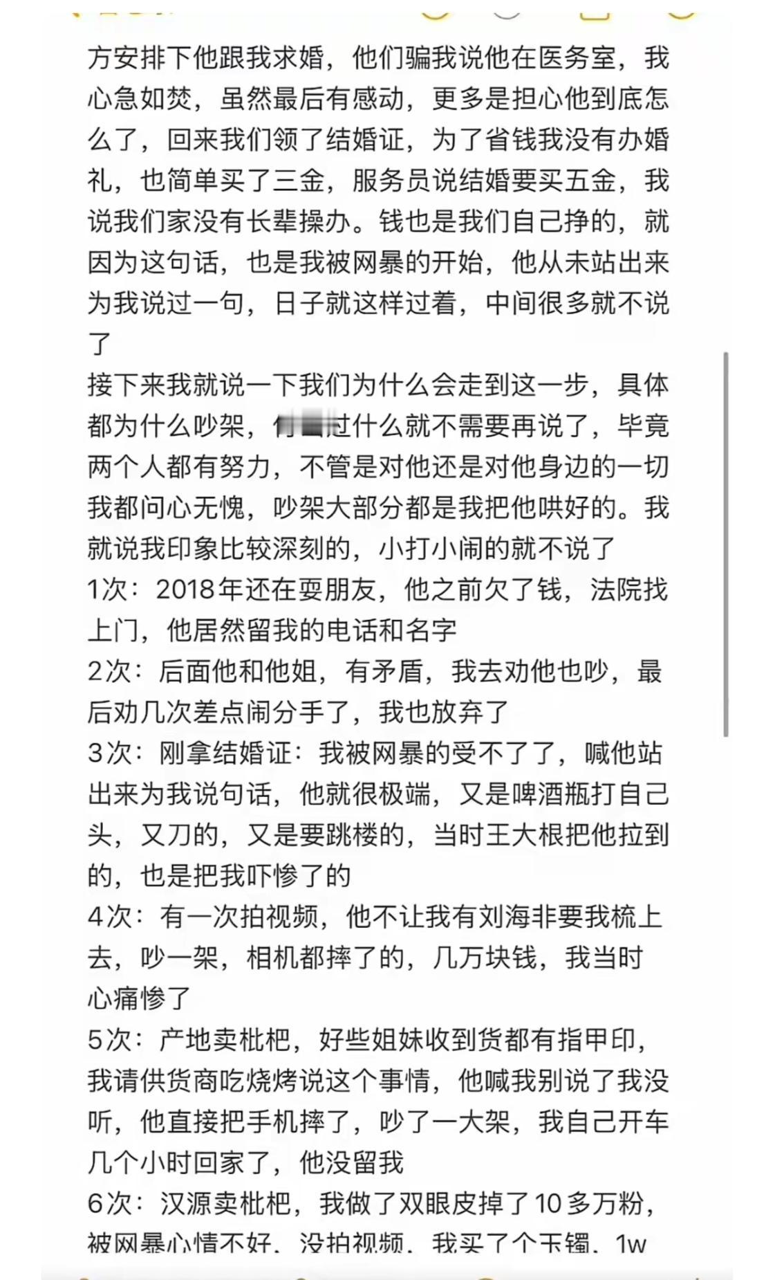 川乡小妹儿洋洋洒洒的一篇文章在凌晨2点49分发出, 粉丝们会默认她的所有说法吗? @兴成爸爸要努力 小二娃还不出来解释一下。 小二娃你说啊!因为姐姐嫁给了型男,你在姐姐姐夫那里工作,后来川乡小妹儿在网上买东西,找到你这个客服,算了认识的开始。 你怎么从cx把她拉回,后来她跟着你去型男视频出镜过,你因为工钱和姐姐闹了别扭。 你自己发展自媒体“500年前的至尊宝”。后来你资金周转困难你边上班兼自媒体,你并不是要放弃至尊宝,你吵着要独立干自媒体才从姐姐姐夫那里出来的,你怎么可能放弃呢?要解决温饱你还得上一下班,川乡小妹儿把你的账号改了。 那这个账号还是属于你啊! 资金没有,超娃那里借了5000给你,不就开始拍视频了吗? 粉丝一点一点来,这倒是实话。 钱一点一点多,这也是实话, 吵架是越来越多, 感情是越来越少! ……你不说,你看有多少人会因为说你30分钟发出离婚协议书,非议你! 川乡小妹儿发的这份吃瓜解释, 你不解释一下吗? 川乡小妹儿婚变 川乡小妹