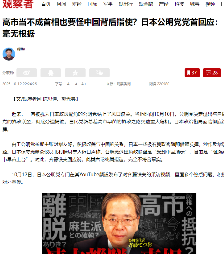 可偏偏有人跳出来瞎扯,说公明党退伙是中国让干的,就为了搅黄高市的首相梦,这听着都让人想笑。