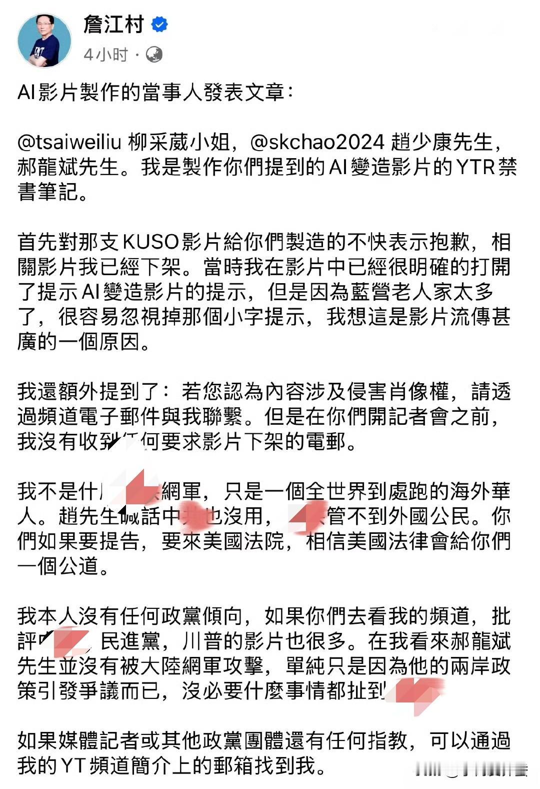 赵少康这下尴尬了,连续开三天记者会,妄言大陆网友介入选情,结果现在,AI柳采葳和他影片的博主出来回应,詹江村转发了。 博主说自己是美籍华人,根本不是什么大陆网友。 他还顺带揶揄了蓝营一把,说影片里明明标了是AI合成的提示,可蓝营里老人家太多,眼神不好,没注意到那行小字,这才让影片传得这么广。 博主还提到,自己额外提示了“若您认为内容涉及侵害肖像权,请透过频道电子邮件与我联系。”,但在赵少康开记者会之前,博主没有收到任何要求影片下架的邮件。 面对赵少康在记者会的指控,博主直接怼了回去:“你跟大陆喊话没用,人家管不着外国公民,如果要提告,要来美国法院,相信美国法律会给你们一个公道。” 最后博主还说,在他看来,郝龙斌根本没被大陆网友攻击,就是因为他的两岸政策引发了争议而已,没必要什么事都往大陆网友身上扯。 这下好了,人家博主验明正身了,赵少康该怎么回?现在是不是该调转枪口喷美国了?毕竟不是大陆介选,难道是美国介选?