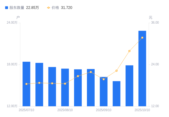 日期A股户数(户)流通A股户均持股数(股)户均持股市值(万元)2025-10-102284656858.9521.762025-09-301787678765.7624.432025-09-2015605310041.6522.302025-09-101621639663.3019.092025-08-301734839032.7519.732025-08-201730169057.1418.712025-08-101740619002.7616.652025-07-311763778884.5416.512025-07-181823228594.8516.092025-07-101839928516.8315.68