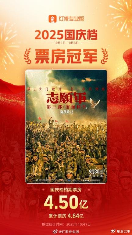位居档期票房榜首的是抗美援朝“志愿军”三部曲的收官之作《志愿军:浴血和平》,4.5亿元。该片从上映首日起便稳居每日票房榜首。