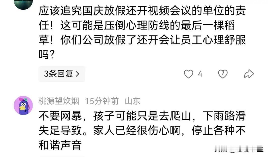 济南失联男子后续:遗体在山崖下发现,网友曝光真实死亡原因 济南29岁男子苏某阳失联9天后,还是传来了坏消息——遗体在玉函山的山崖下被找到了,守在山脚的母亲当场崩溃大哭。 此前大家猜了不少原因,有人说他是被家里催婚、单位放假开会议逼得想不开,各种说法传得沸沸扬扬。直到救援人员和网友曝出真相,才知道是场意外。 原来苏某阳高度近视,失联那几天山里一直下雨起大雾,三米外都看不清路,山路湿滑得很。他进山散心时迷了路,不小心失足坠崖,手里还紧紧攥着手机,明显是想要求救却没成功。 一场意外带走一条命,实在让人惋惜,也给大伙提了个醒:坏天气千万别往复杂地形闯。作品声明:内容取材于网络