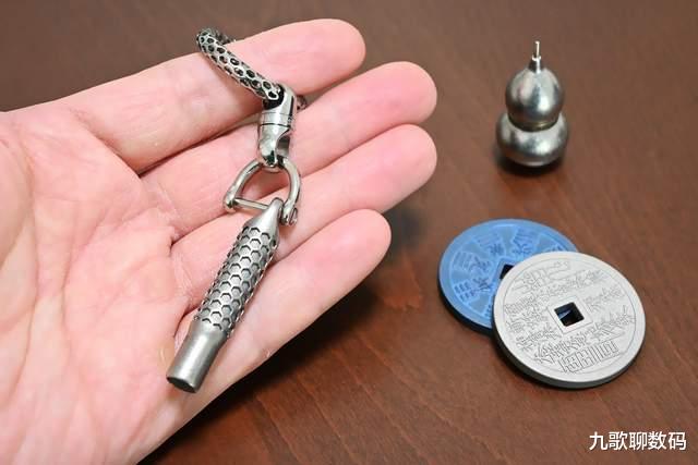 TC4钛合金耐腐蚀,更轻盈,且不易生锈,是这种EDC把玩件的不二之选。腰部所镶嵌的雕花铜圈非常漂亮,仔细观会发现其精细的雕花纹路。众所周知,铜把件极耐盘玩,虽着时间的推移会在上面留下岁月的包浆痕迹。而正中的挂孔可以搭配挂链当做脖项中的挂饰,也可与钥匙扣搭配串在其上,方便携带。