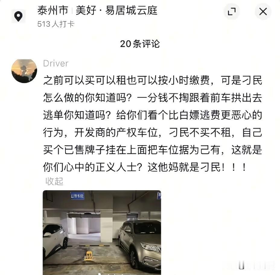 泰州美好易居城到底发生什么事了? 这两天看到很多关于当地美好宜居城门口有大量居民聚集、封路、闹事等等情况,甚至于公交车都被逼着掉头,围满了帽子叔叔。 稍微查了一下,有说是原来有车位半免费向居民开放,现在被开发商拿来锁了。不租、不买车位就不能停到地下车库去,于是闹事。 当然还有说是居民恶意逃单,是刁民,不买不租,擅自挂个已售的牌子就去抢车位,不交钱,逼得开发商走投无路? 希望能来个当地的居民告诉我真相[狗头]